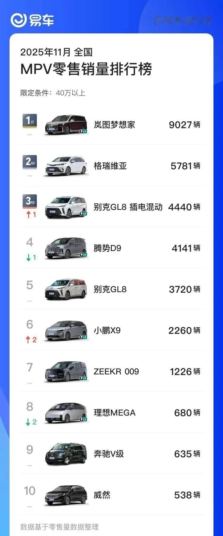岚图梦想家11月MPV零售榜第一,高端MPV销量第一。在鸿蒙智行MPV没有上市之前,梦想家销量一直是华为系销量第一的MPV. 华为乾崑HI模式的奕境也规划有MPV车型,不知道什么时候上……
