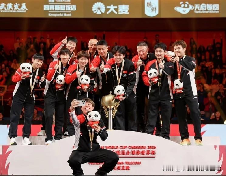 孙颖莎越来越往边上站了。但是胸前的奖牌却越来越亮了。 2023年是8:5赢下日本队的。 2024年是8:2赢下日本队的。 2025年是8:1赢下日本队的。比赛结果是越来越好了。队友们的年龄没有一个超过三十岁,适配度更高,灵活性更大,几乎都轮不到双打比赛就结束了。能出力的出力。能捧场的捧场。每个人的脸上都洋溢着开心的笑容。