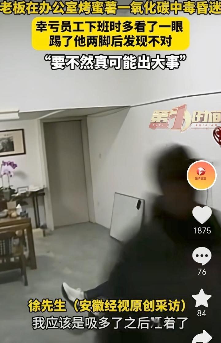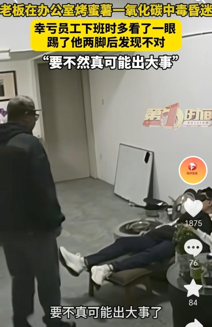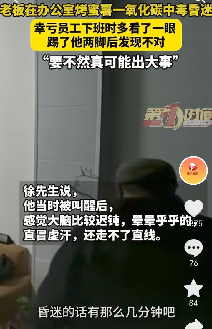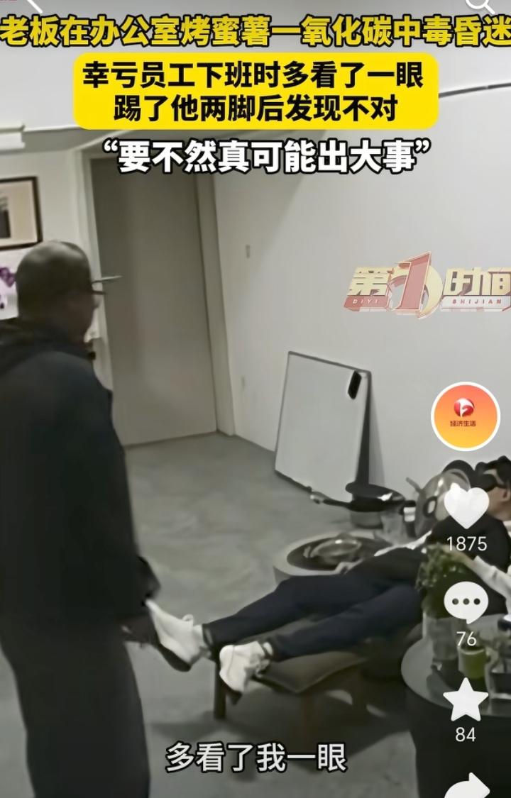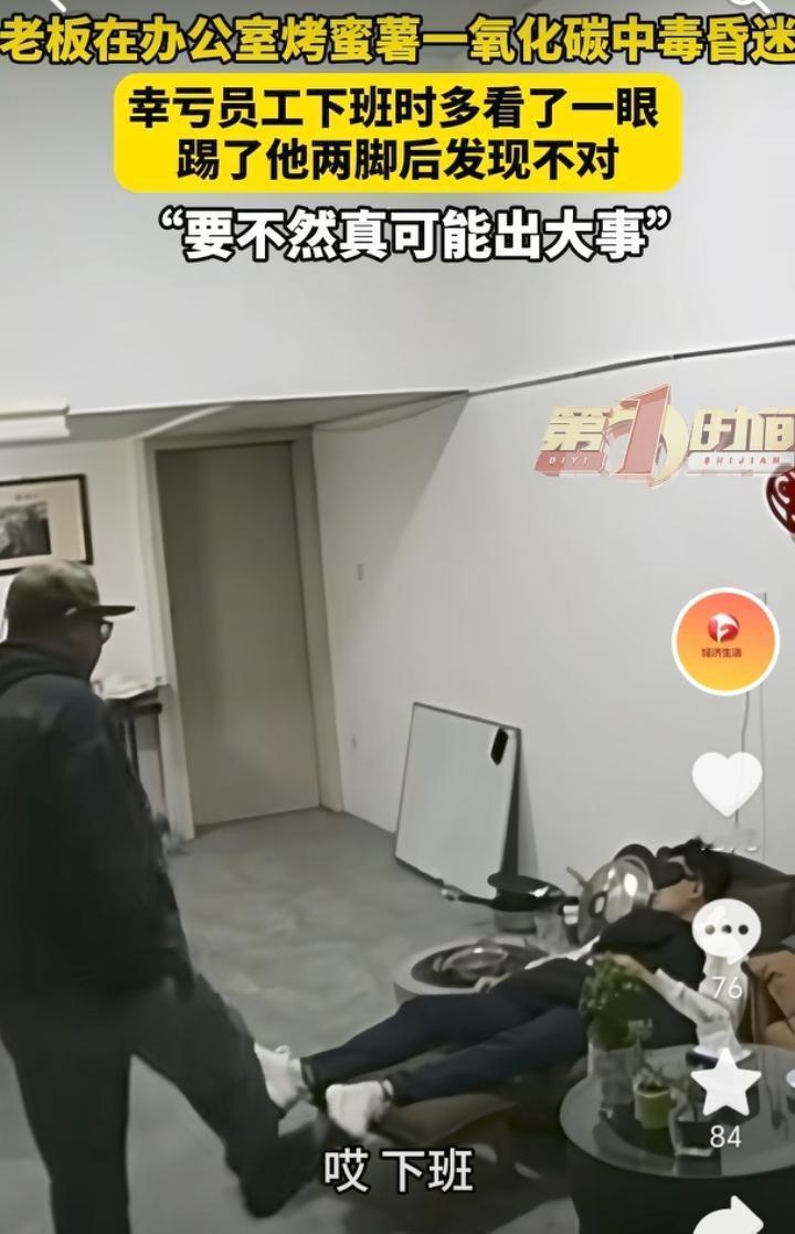 加点工资报答!山东青州,员工下班顺便去喊老板,结果发现老板躺在办公室没动静,于是员工就踢了老板脚两下发现老板还是没有反应,员工走近一看发现不对劲,立马跑到窗边打开窗户通风。原来是老板在办公室烤蜜薯结果一氧化碳中毒昏迷,被叫醒后去医院做了检查现在已经没事。 从员工踢了老板脚两下可以看出,他和老板关系处的不错,可能平时是老板和员工的关系,私人两人已经成为了哥们。 不过也是多亏了员工下班去喊,不然没有人去发现可能会出大事,所以这也算是救命之恩了,给加点工资应该不为过。 冬天在家烤火一定要注意,门窗千万不要紧闭,因为紧闭门窗空气不流通很容易中毒昏迷。