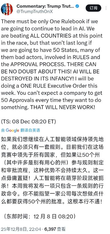 很多媒体好奇“只包含一条规则的行政命令”,究竟会是什么!美国总统特朗普在北京时间12月8日晚发文表示,如果美国想继续在人工智能领域保持领先地位,就必须只有一套规则。 他话说得挺狠,说美国现在AI领先全世界,可要是让50个州各搞各的规则,企业做件事得50个州都批,这领先优势早晚没了,AI刚冒头就会被折腾死。 这话一放,所有人都猜:就一条规则,到底管啥?是不让各州瞎插手,还是给企业开绿灯?答案得等本周命令发布才知道,但这事的根子可比一条规则深多了。 先说说美国现在的AI监管有多乱,联邦政府一直没拿出统一办法,各州只能自己上阵填窟窿,最典型的就是加州,2025年10月1号已经签了自己的AI安全法案。 加州的法案管得还挺细,要求AI公司公开安全协议,防止用来造生物武器、攻击银行这些要命的事,出重大安全事故15天内得报告,违规一次罚100万美元。 加州州长纽森早就骂过联邦政府不作为,说国家连个统一框架都没有,风险根本防不住,可他这一搞,其他州跟着学,德州、纽约州都在憋自己的规则。 大家想想,一家AI公司要在全美做生意,得吃透50套规则,一套没弄明白就罚百万,这哪有心思搞创新?难怪特朗普说要“一条规则管到底”。 其实共和党之前就试过阻止各州乱搞,今年早些时候想提法案,十年内不让各州自己监管AI,结果没通过,现在特朗普直接要上行政命令,绕开议会来硬的。 有人说特朗普是为了AI好,这话只对了一半,他更想把监管权攥在联邦手里,毕竟50个州有红有蓝,各自为政根本没法实现他想要的“快速领先”。 硅谷的企业其实早憋坏了,有个搞AI安全的公司老板私下说,他们光研究各州规则就占了团队三成精力,比搞技术还累,早盼着统一标准了。 可各州也不乐意,加州就放话了,联邦要是搞的规则太松,不管安全,他们肯定不认,到时候联邦和州对着干,企业更难办,这矛盾可不是一条规则能解的。 你觉得这事怪不怪?美国总说自己创新厉害,可连个统一的监管规则都搞不定,还得靠总统发命令强推,这跟咱们说的“既要又要”是不是有点像? 再看看别的地方,欧盟虽然磨磨蹭蹭,但2024年就通过了统一的AI法案,不管哪个国家都得按这套来,企业不用来回折腾,专注搞技术就行。 特朗普说怕AI被扼杀,可他没说另一个风险:要是就一条规则管得太松,AI搞出乱子谁负责?加州的100万罚款虽然狠,至少能逼企业守规矩。 有专家猜,特朗普的“一条规则”大概率是“联邦优先”,就是各州不能搞比联邦更严的规定,可这样一来,加州那些安全要求不就白弄了? 硅谷的工程师私下吐槽,他们不怕管,就怕乱管,今天加州说要报告这个,明天德州说要审核那个,刚改完又要换,再好的想法也被磨没了。 特朗普想靠一条规则保住领先,想法挺美,可他没搞懂,AI监管不是“一刀切”就行,得平衡安全和创新,联邦和州各让一步才能成。 之前有个做医疗AI的公司,因为各州审批标准不一样,明明在加州通过了,到纽约州又得重新测,拖了一年才上线,错过最好的市场时机。 这事说到底,是美国老毛病又犯了,联邦和州争权力,最后遭殃的是企业和创新,就算特朗普发了命令,各州要是硬顶着不执行,还是白搭。 技术发展从来不是靠“一放就乱、一管就死”,得有个清晰的规矩,让企业知道边界在哪,这样才能放心创新,这道理不管是美国还是别的地方都适用。 特朗普的“一条规则”能不能成还不好说,但它戳破了一个真相:再厉害的技术,也扛不住混乱的管理,要想领先,先把自己的规矩理顺了才是根本。 信息来源: 新华网——2025-12-09特朗普称将在联邦层面统一人工智能监管规则