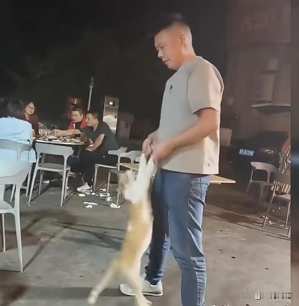 一只可怜的流浪猫,为了能够活命,就是在大排档的桌子底下捡点骨头吃,可是有些人就不想放过它,就想虐待它,这真是让人无法理解,它也没招你,也没惹你,干嘛要如此对待它?画面中的这个男子看起来挺壮实,眼神也很犀利,下手也很重,这只猫被他抓住双腿,猛烈的荡了一阵秋千,最后没有了惨叫声!
