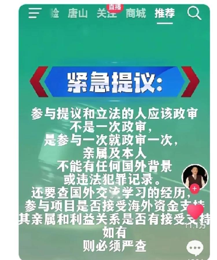 卢麒元提议:参与提议和立法的人应该政审,每次参与都要重新政审一次,亲友及本人不能有国外背景或违法记录! 卢麒元提出的这个提议,核心是想给参与政策制定和立法的人套上更紧的“安全绳”,咱们先从现有的政审制度说起。 现在考公务员、当兵、进涉密岗位,都要过政审这关,查的是本人有没有违法记录、是不是真心拥护国家,还要连带查直系亲属,比如父母子女有没有危害国家安全的行为。 像《公务员法》就明确写着,受过刑事处罚的人不能当公务员,征兵时如果家人有严重政治问题,子女也不能入伍。这些规定其实已经在源头筛掉了一批不合适的人。 但卢麒元的想法不一样,他觉得“一次性政审”不够,得“每次参与都审”,为啥呢?举个直白的例子,一个人十年前入职时政审合格,但十年里可能出国定居了配偶,或者亲属在国外有大笔资金往来,这些新情况会不会影响他的立场? 现在的政策制定经常涉及经济、科技、外交等敏感领域,比如制定外资政策时,如果参与人亲属在海外有公司,会不会不自觉地偏向外资利益? 现有的制度对在职人员的动态审查其实有限,更多是入职时的“一次性体检”,而提案立法是持续的过程,今天讨论税收,明天讨论科技补贴,每次议题都可能暴露新的利益关联。 再说审查范围的扩展,现在政审主要查直系亲属和配偶,卢麒元提到的“亲友及本人不能有国外背景”,其实和现行某些规定有呼应。 比如2025年新出台的《从律师专家中选拔立法工作者办法》就规定,配偶或子女移居国外的人不能参选,这说明政策制定者的海外关系已经被纳入考量。 但卢麒元的提议更严格,不仅是亲属移居,还包括海外学习、资金支持等“关联背景”,比如一个专家经常接受国外机构的研究资助,虽然没有违法,但这种利益关系会不会影响他提案的客观性?这就需要更细致的审查。 这里有个关键问题:政策制定的独立性,现在全球化程度高,很多专家学者有海外留学经历,亲属在国外生活也很常见。但审查不是要歧视这些人,而是防止“利益捆绑”。 比如澳门2025年修订的《立法会选举法》就明确,候选人如果接受过境外反华组织的培训或资助,直接取消资格。 这说明,当个人或亲属的海外关系可能干扰国家利益时,审查就成为必要手段,卢麒元的提议其实是把这种“澳门经验”推广到全国层面,并且覆盖到每次提案环节,而不仅仅是选举时。 还有一个现实考量是政策制定的动态性,比如2023年某省在制定新能源补贴政策时,参与专家的亲属刚好在相关企业任职,虽然没有违法,但最终政策被质疑有利益输送。 如果每次提案都重新政审,就能及时发现这类新增的利益关联。现行制度中,法官、检察官的选拔已经有“动态考核”,但立法提案环节还缺乏类似机制。 卢麒元的提议实际上是想补上这个漏洞,让每个参与政策讨论的人,每次都要重新说明自己和亲属的最新情况,比如有没有新增的海外投资、有没有亲属加入外国国籍。 当然,这里面也有操作难点,比如“国外背景”怎么界定?留学经历算不算?海外亲属的正常探亲往来算不算?根据现有的法律实践,比如《公安机关录用人民警察办法》,只要亲属没有危害国家安全的行为,单纯的海外居住并不构成否决条件。 卢麒元的提议可能更侧重“利益冲突”而非“身份歧视”,比如亲属在海外有涉及提案领域的商业利益,就需要回避。这种审查不是要搞“连坐”,而是防止“一人提案,全家受益”的情况。 另外,持续政审的成本问题,每次提案都启动政审流程,会不会增加行政负担?对比现行的公务员年度考核,其实很多单位已经在做定期审查,只是内容侧重工作表现而非背景。 如果将提案参与资格与动态背景审查挂钩,可能需要建立更简化的申报机制,比如每次参与前填写最新的亲属及海外关系申报表,由专门机构快速核查,就像现在的人大代表履职前需要申报财产一样,背景审查可以作为履职的前置程序。 最后,回到提议的本质:维护政策制定的公信力,这些年,公众对“专家建议”的质疑时有发生,比如建议征收房产税的专家被扒出持有多套房产,建议延迟退休的学者亲属在社保机构任职。 卢麒元的提议其实是想通过制度设计,让参与政策制定的人“干干净净”上阵,减少公众对利益输送的猜疑。 这种审查不是针对个人,而是针对权力运行的关键环节——毕竟,立法提案影响的是千家万户的利益,确保参与者没有“背后的钩子”,才能让政策更经得起推敲。