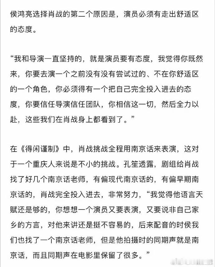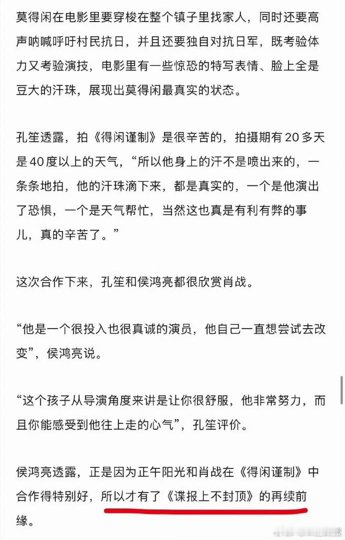 侯鸿亮回应选角决策,称《得闲谨制》的成功合作让团队坚定选择肖战,他在片中传递的匠人精神与影片 “谨制” 内核呼应,私下谦逊敬业的态度也获认可。内外兼修成为再续缘的关键。侯鸿亮透露和肖战二搭的原因侯鸿亮回应谍报上不封顶选肖战