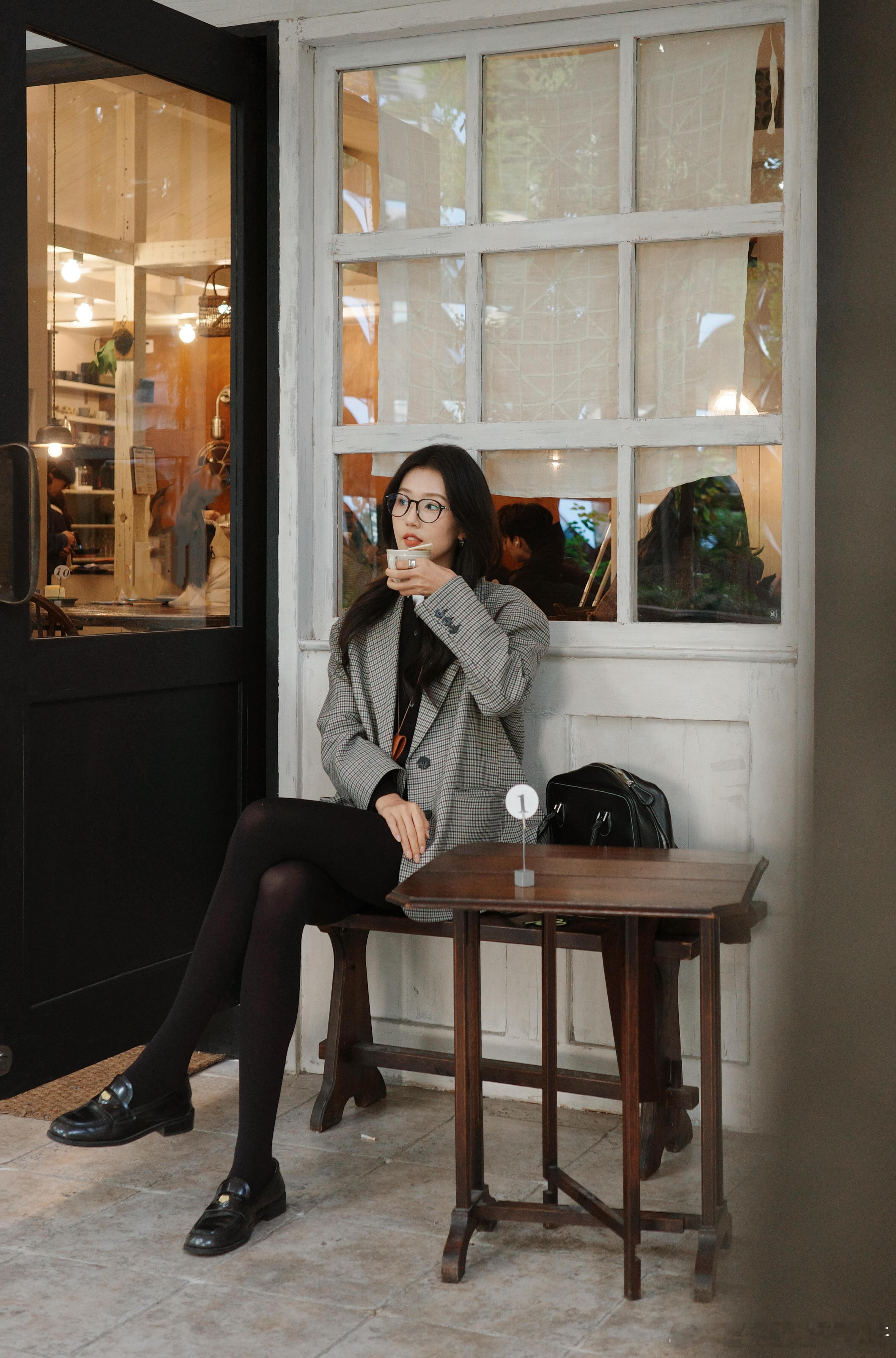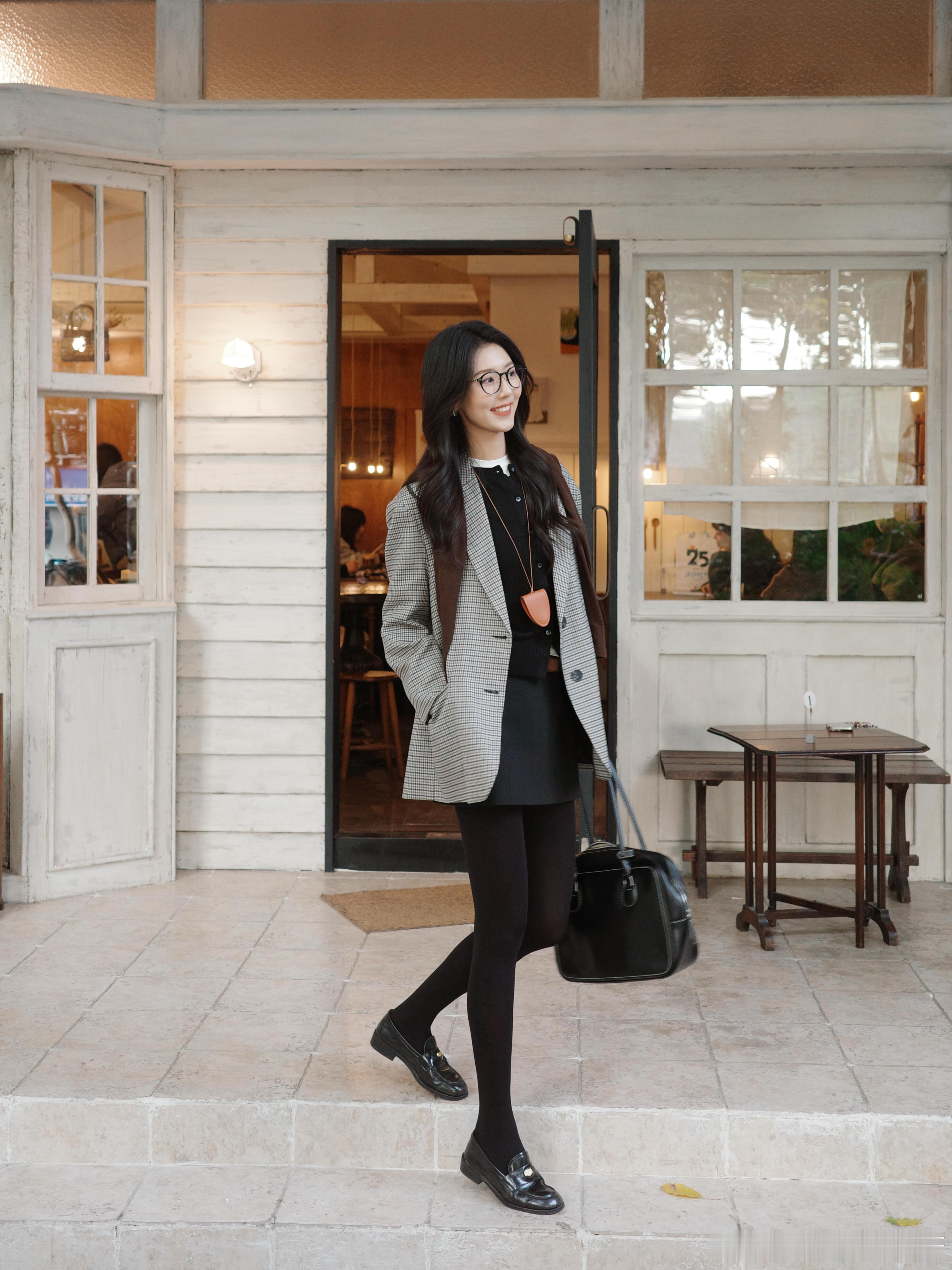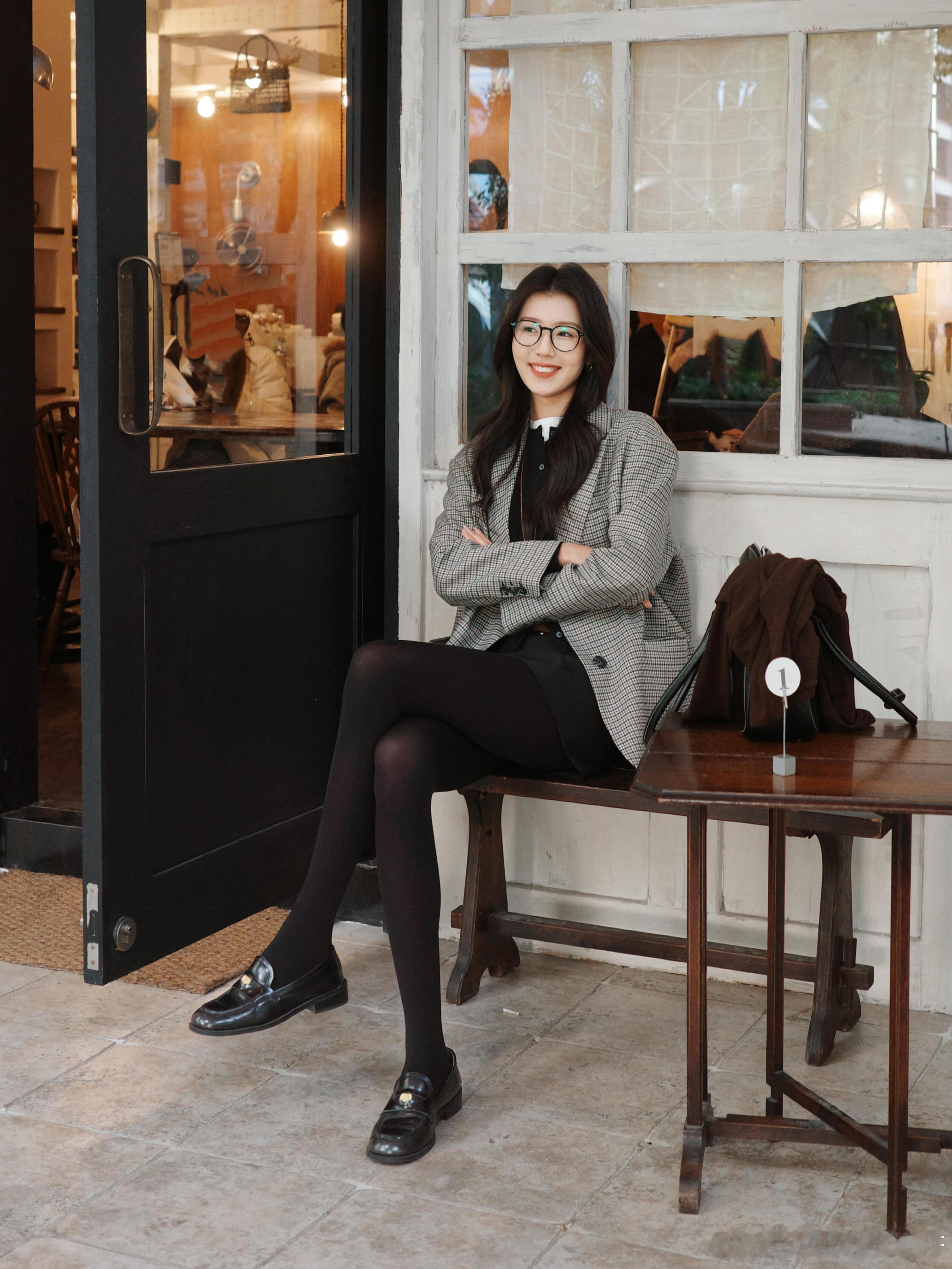 白色蝴蝶结领衬衫搭配咖啡色半身裙薄款咖啡色连裤袜高跟鞋~