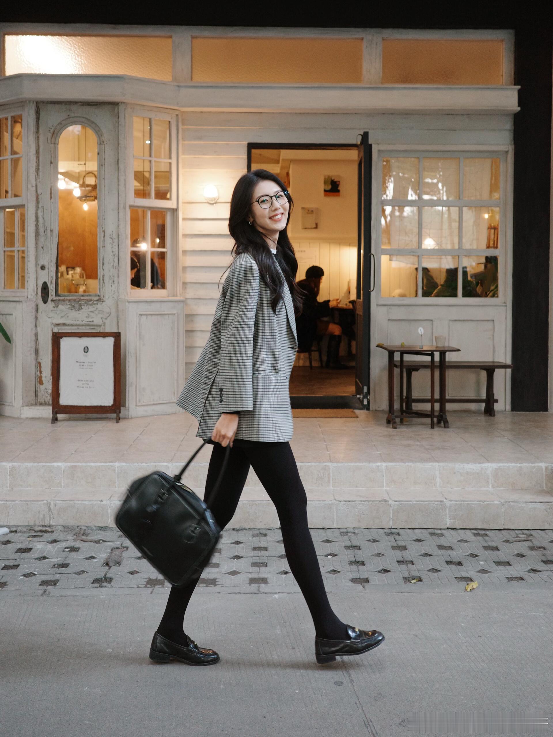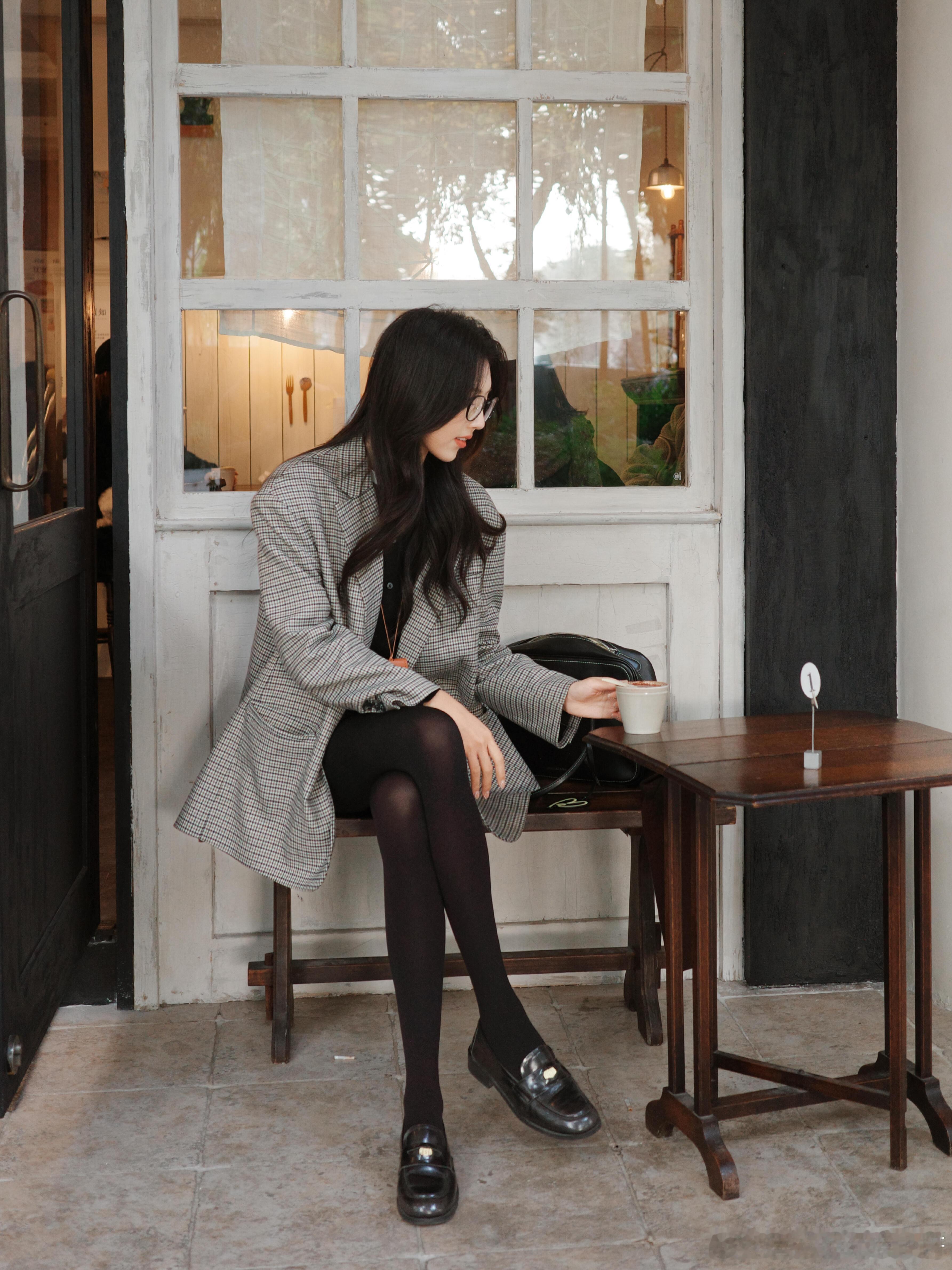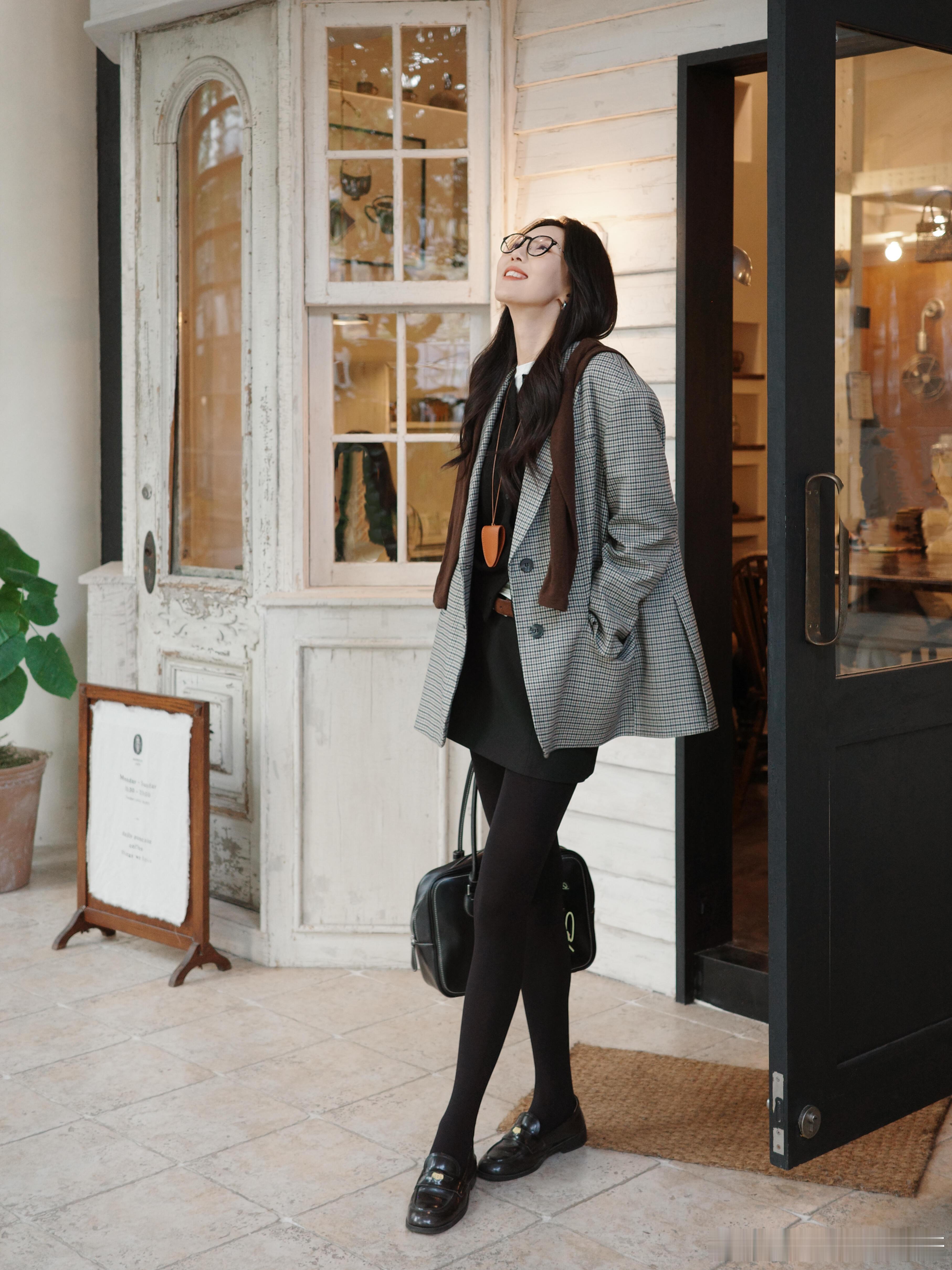 白色蝴蝶结领衬衫搭配咖啡色半身裙薄款咖啡色连裤袜高跟鞋~