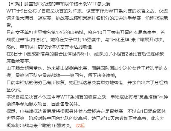 韩媒:膝盖韧带受伤的申裕斌带伤出战WTT总决赛,作为韩国王牌选手,本人也不想错失此次比赛机会,确实是非常重要的比赛! 从比赛中,可以看得出来,申裕斌是一位非常拼的运动员,年轻有活力,并善于总结! 生活中,带着小调皮,十分可爱!申裕斌长相甜美,总是笑容满面,是我外协选手比较喜欢的。 我认为,带伤比赛是珍惜比赛和努力拼搏的表现,但是不一定是明智的选择,因为有可能会变得严重,所以,在医队评估下可以比赛,很重要!