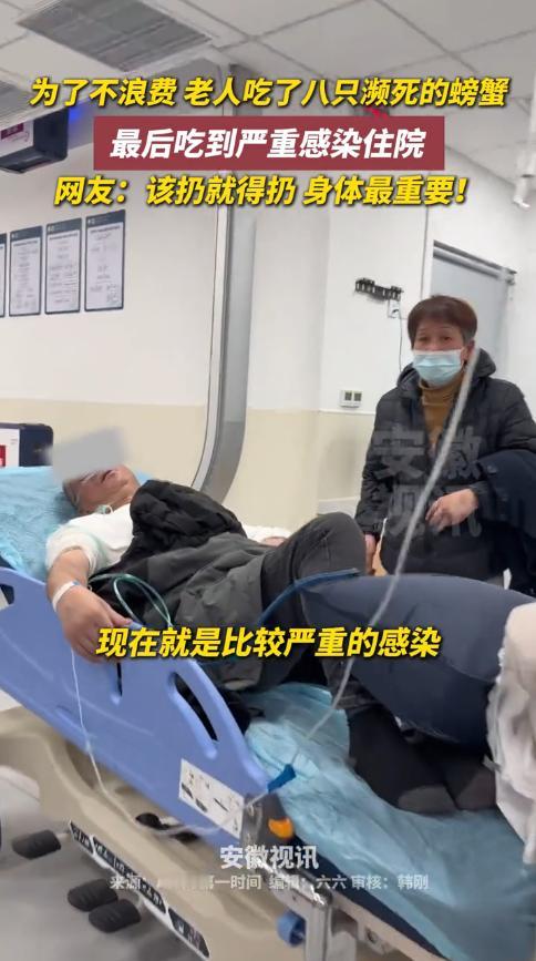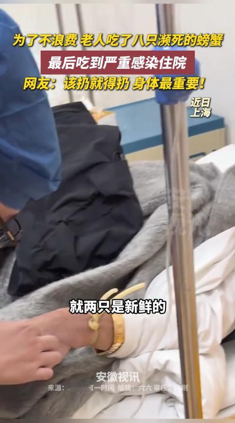 “这下后悔了吧!”12月6日,上海,一男子为了不浪费食物,吃了8只濒死的螃蟹,结果很快就上吐下泻、发起高烧!家人见状急忙将其送去医院,检查后发现身体已经严重感染,必须住院治疗。网友:应该煮熟放冰箱保存的! 节约粮食那是咱们的传统美德,很多人也都是这么实行的,尤其是老一辈的人,他们更知道一粥一饭来之不易,对于剩菜剩饭也舍不得扔,可是有些剩菜还是扔了比较安全。 几天前,男子在菜市场买了10只鲜活的螃蟹,到家后,先拿出2只做熟了吃,剩下的则放在厨房里先养着。 等到男子再来吃螃蟹时,发现剩下的几只螃蟹已经半死不活了,可这毕竟是自己花了钱买来的,直接丢掉多可惜,于是他还是做熟全都吃了。 可是没想到,几个小时后,男子的身体就出现了不适症状,一开始以为是闹肚子,所以并未在意,可到了晚上,病情变得更加严重,家人急忙将他送去医院检查。 抽血化验后,医生发现男子各种指标都不对,应该是细菌感染,于是立即给男子安排了相关的治疗。 为了节省那几十块钱,却要花上千元住院,想必男子也是很后悔,不仅身体遭了罪,钱还一分都没少花! 大家在购买螃蟹时,一定要按需购买,尽量挑那些有活力的,至于死蟹就不建议吃了,没有必要冒那个风险。 信息来源:《为了不浪费 吃了隔夜螃蟹,没想到竟让身体遭了罪,网友:身体永远比节约更重要 叔叔早日康复》AHTV第一时间