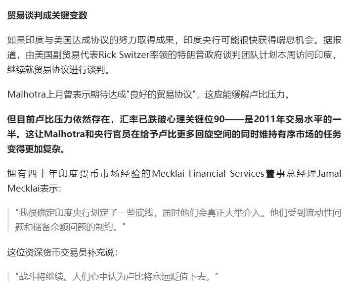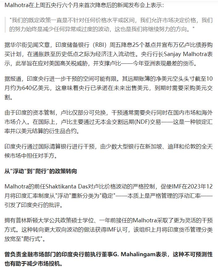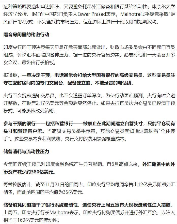 印度央行正通过难以预测的干预策略应对卢比跌至历史新低的困境。这场保卫战在隔音房间内展开,专职交易员接收秘密指令——有时是每分钟抛售1亿美元,有时是不计代价打压至目标水平,有时则是完全观望。 文章来自:华尔街见闻《每分钟售出1亿美元:印度卢比保卫战》