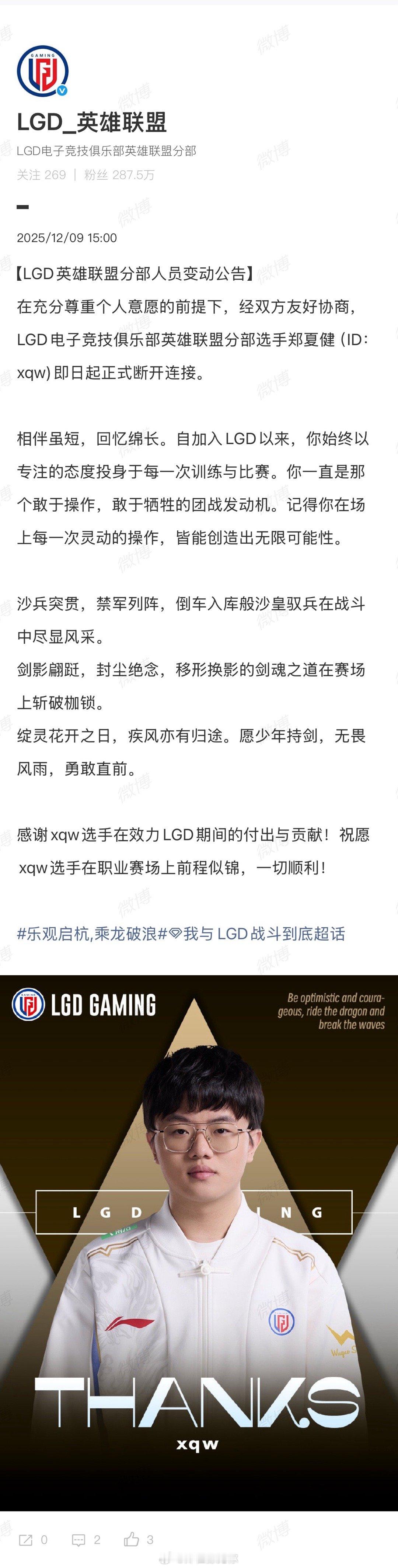 lgd官宣xqw离队 【LGD英雄联盟分部人员变动公告】在充分尊重个人意愿的前提下,经双方友好协商,LGD电子竞技俱乐部英雄联盟分部选手郑夏健(ID:xqw)即日起正式断开连接。acg优创官全网热点共创计划英雄联盟