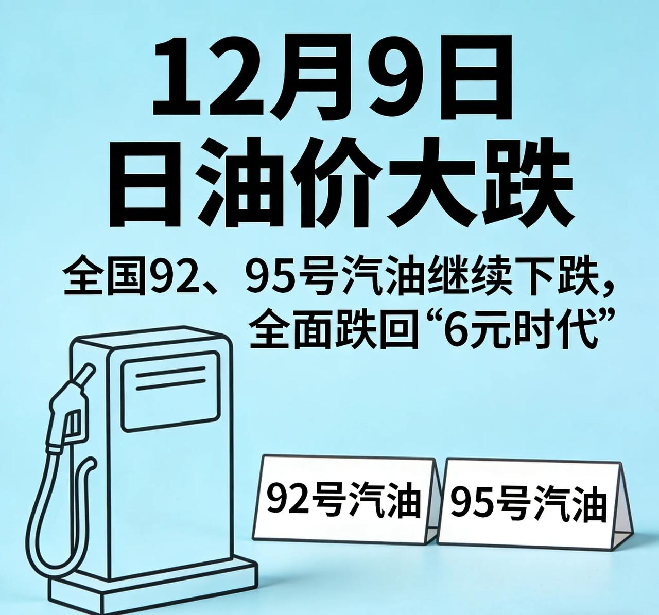 刚加完油!12月9日油价真的跌回“6元时代”了 早上路过加油站顺便补油,抬头一看价格,92号汽油每升6块7毛多,95号也才7块出头,终于不用再为加油心疼钱包了。 查了下才知道,这次调价是12月8号24点开始的,国内汽柴油每吨都降了55块。折算下来,92号每升少花4分钱,95号和0号柴油每升少5分。别看单次降得不多,但这已经是2025年第11次油价下调了,算上之前的调整,今年总共经历了24轮调价,7涨11跌6搁浅,整体还是往实惠走的。 加油站工作人员说,最近来加油的车主明显多了,尤其是开SUV的,以前加满一箱95号要500多,现在480左右就能搞定。不过也有老司机提醒,下次调价可能要涨,因为国际油价现在处于震荡期。 你们那儿现在油价多少?