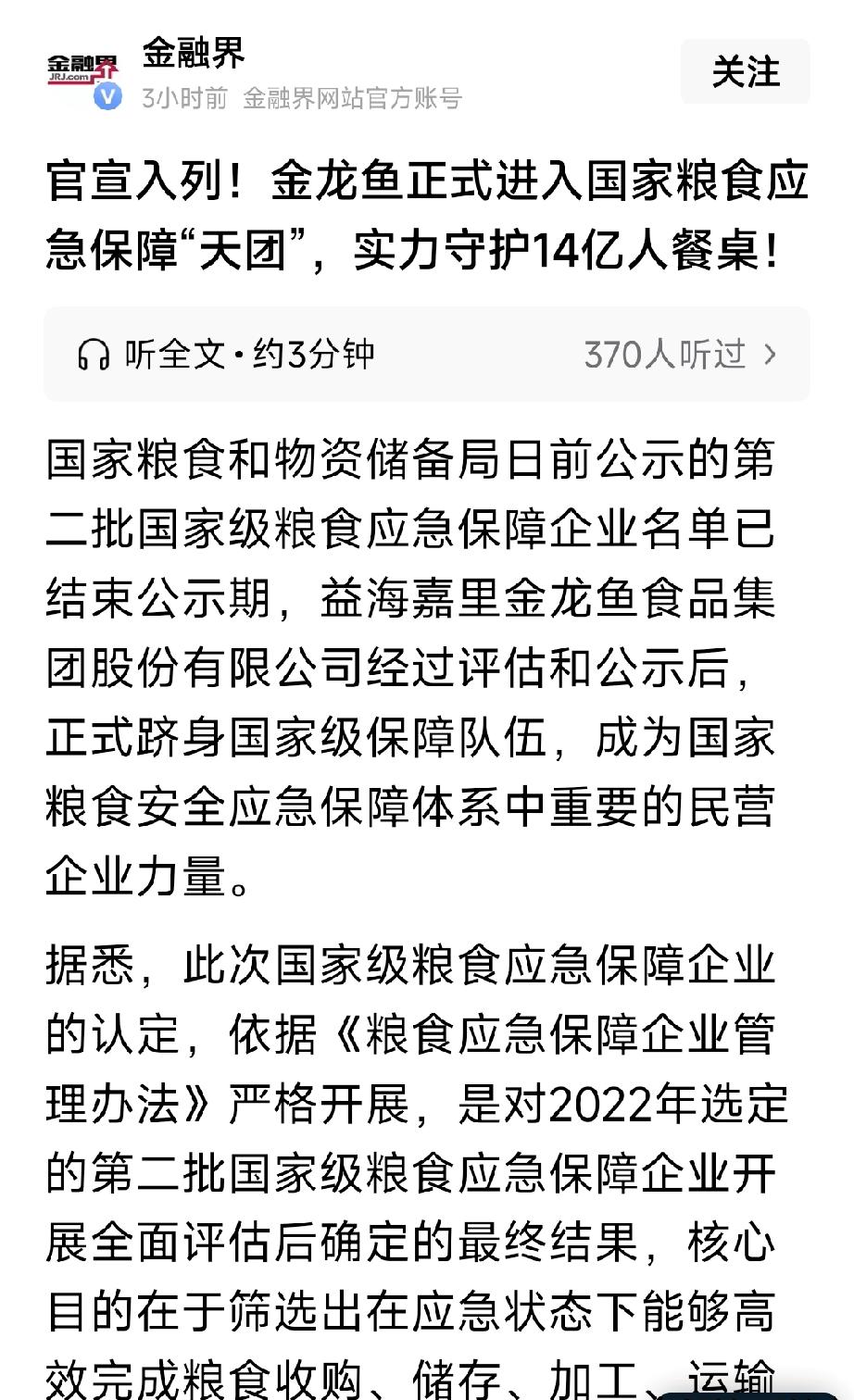 好消息,金龙鱼正式进入国家级保障队伍,用实力守护14亿中国人民餐桌。