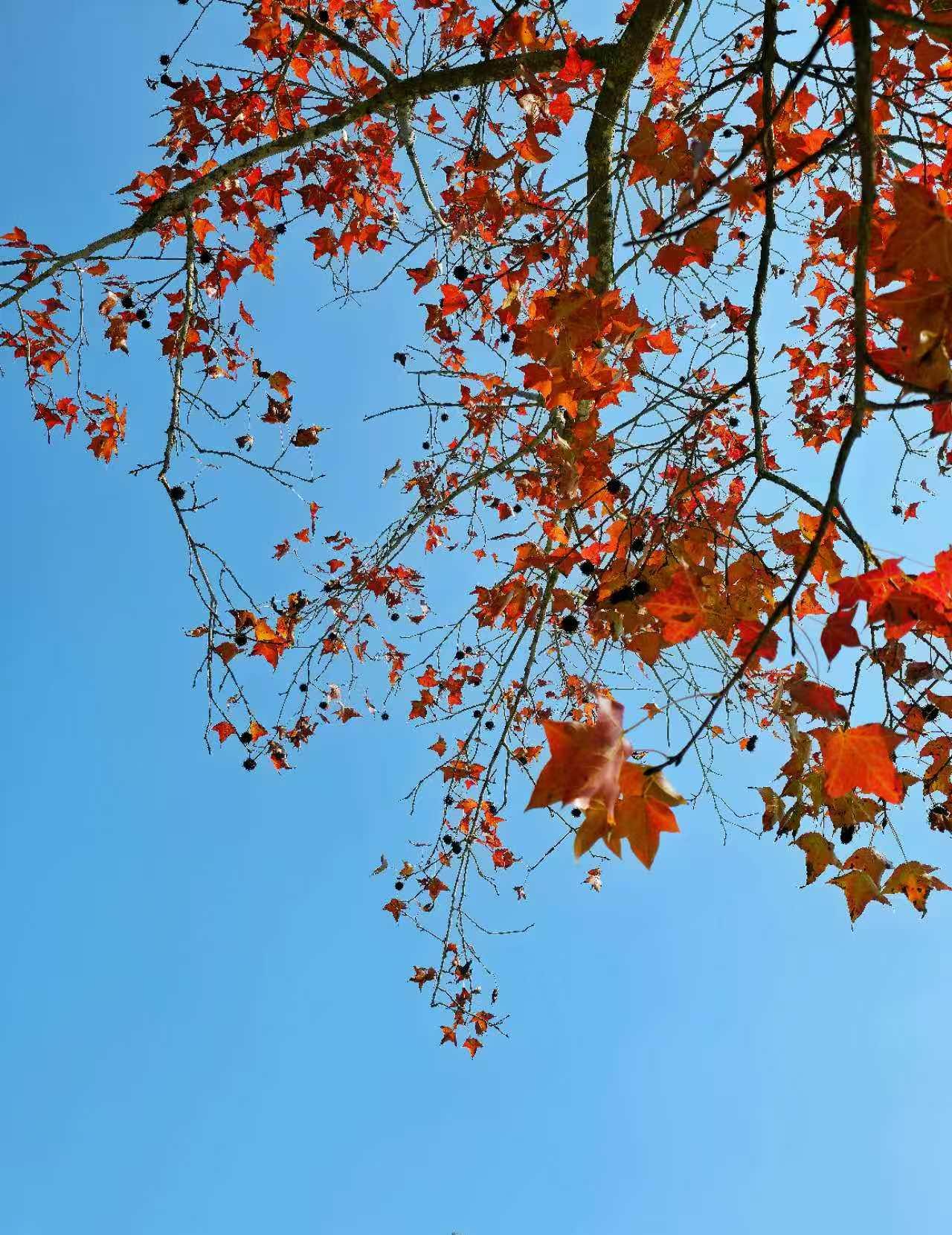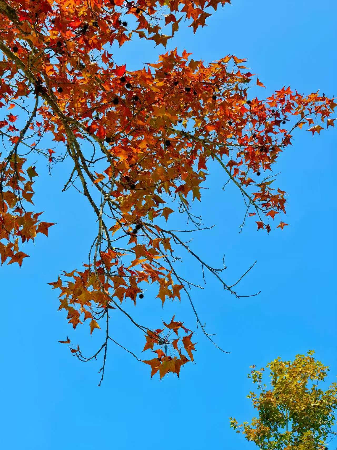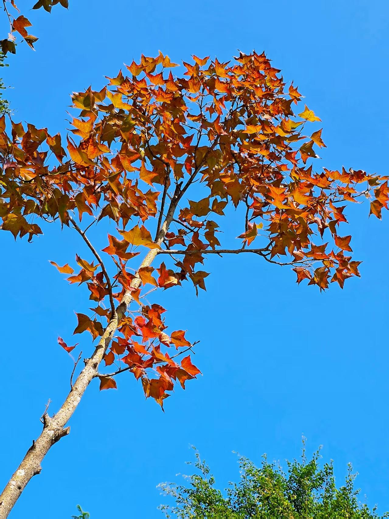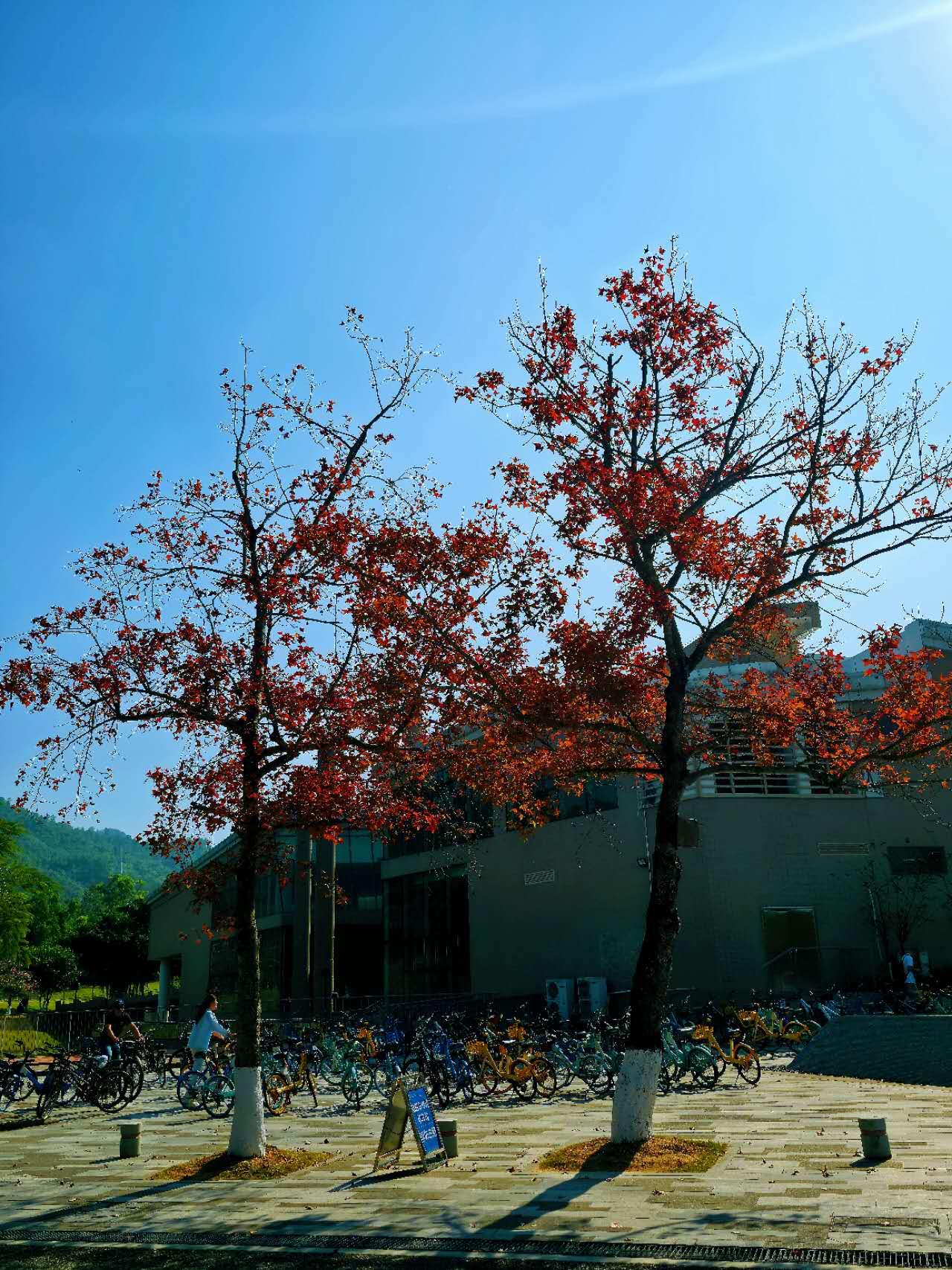 秋意渐浓,枫叶飘红,蓝天映衬,美不胜收。 秋意渐浓,枫叶飘红,蓝天映衬下的景色确实美不胜收。就像校园里的枫叶,红得似火,与蓝天白云交织,宛如一幅绝美的油画。 风把调色盘打翻,红枫爬满校园边。课铃摇落的枫叶,夹进课本成了秋天的书签。石阶印着碎红笺,脚步轻踩过流年。当第一片枝叶染上朱红,仿佛是对自由的向往,金风将它吹起,飘向自由的彼岸。 自古红叶最多情,片片飘飞如蝶舞。在这秋意中,赏着枫叶,感受着自由与浪漫,真是惬意极了。 枫叶红时秋景美