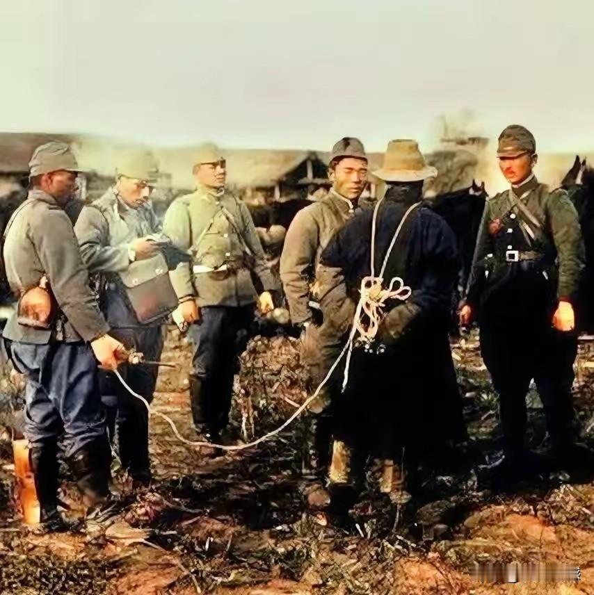 在我们的国土上,当年的日本鬼子任意逮捕无辜的人,任意屠戮无辜的人,这就像是一群强盗来到了别人家,既要占领这个家庭,还要抢夺这个家庭的财物,还要逮捕这个家庭的人,还要屠戮这个家庭的人,这就是日本鬼子的强盗行为。画面中被它们抓住的这个人,双手被反绑在后面,还用绳子牵着,还在审问中,这个人最后的结局可想而知,必然是凶多吉少!