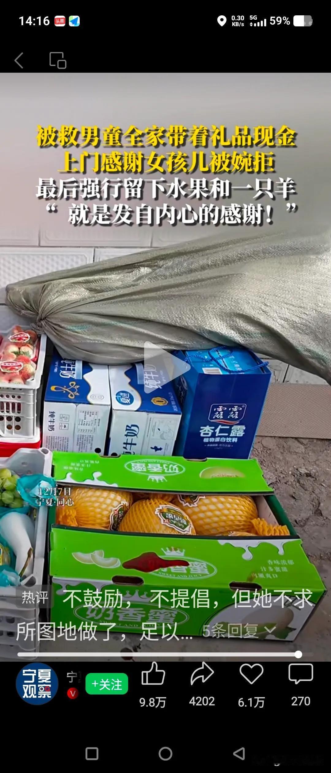 宁夏这事儿办得太硬核了!为了感谢救命之恩,被救那家人直接抬着一只宰好的羊找上门。 事情发生在宁夏,当地一名13岁初一的小姑娘,在放学路上遇到一名男子掉进水库,她没有犹豫,飞奔过去脱掉外套跳下水中,最终把男子拖到岸上,才浑身湿透。 回到家,小姑娘怕父母担心,编谎称被洒水车淋湿,直到小姑娘的亲姑在视频中认出她,才知道她的见义勇为。 被救男孩家人也很感激她的勇敢,男童全家带着着礼品现金,上门感谢女孩儿被婉拒,最后强行留下水果和一只羊,就是发自内心的感谢! 网友们说 所在学校也应该给予小姑娘表彰,这么小的年纪,就有这么大的勇气,实在是太值得学习了。 对此,大家怎么看呢