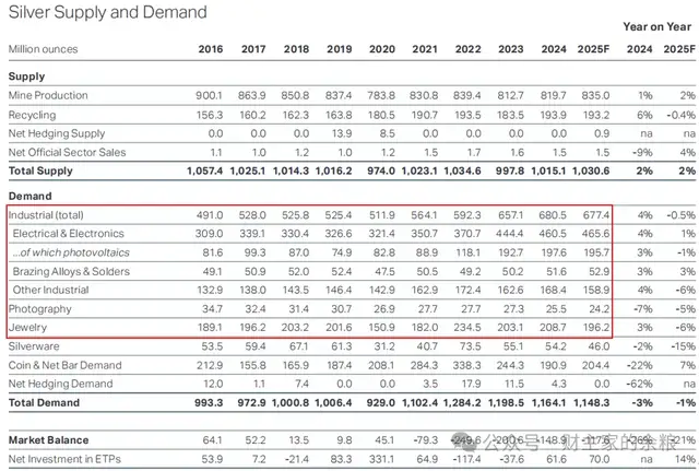 查阅世界白银协会提供的历年白银供需平衡表,工业用银、特别是光伏用银,在2023-2024年持续大幅度增长(表格中2025年数据为预测),这意味着,市场上的现货需求持续保持旺盛。