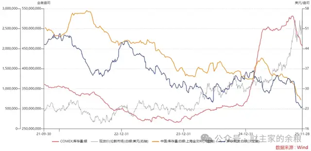 但是,自2025年10月初开始,这种情况出现了变化,Comex的白银库存开始迅速下降,从9月底的5.3亿盎司迅速下降至目前的4.6亿盎司,与此同时,国内两大白银交易所的白银库存也是从10月初开始骤降。