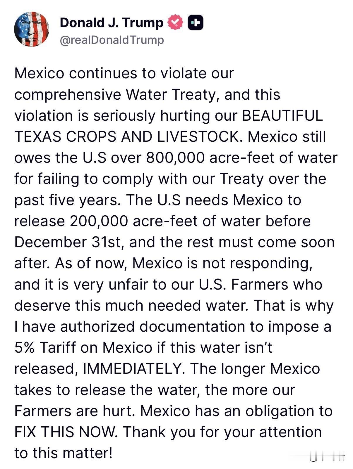 唐纳德·特朗普 (Donald Trump) 指责墨西哥违反了 1944 年美墨水资源条约,导致美国德克萨斯州的农作物和牲畜遭受损失,并威胁要对墨西哥征收 5% 的关税。 特朗普称墨西哥在过去五年未能履行条约义务,拖欠美国超过 80 万英亩-英尺的水量。 他要求墨西哥在 12 月 31 日之前立即释放 20 万英亩-英尺的水量,其余水量也需尽快跟进。 威胁措施: 如果墨西哥不立即释放水资源,他已授权文件,准备对墨西哥征收 5% 的关税。 根据 1944 年条约,美国每年需向墨西哥提供科罗拉多河的水,而墨西哥则需在每个五年周期内向美国提供来自格兰德河支流的平均水量。由于持续的干旱,墨西哥一直难以满足其供水义务,这在两国间引发了长期的争议。 最新进展,该五年周期已于 2025 年 10 月 24 日结束,墨西哥最终未能达到其最低交水义务。德克萨斯州州长格雷格·阿博特(Greg Abbott)也要求对墨西哥的违约行为采取行动。