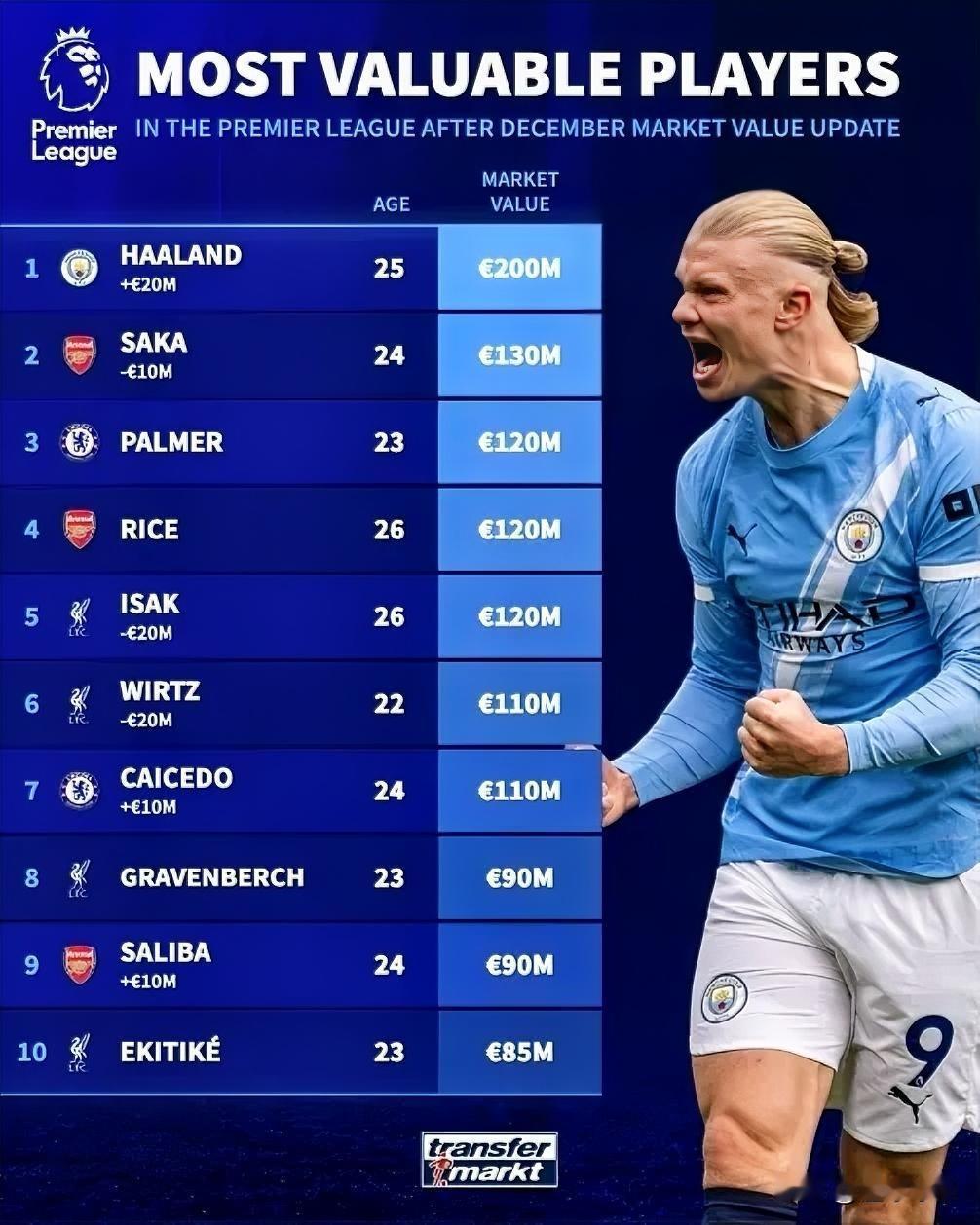 足坛第一人,哈兰德身价上涨2000万欧元再次回到2亿欧元! 刚刚,《德国转会市场》更新了英超联赛球员最新身价,备受关注的哈兰德身价上涨2000万欧元,又回到了曾经的2亿欧元,与亚马尔并列成为当今足坛身价最高的球员。 哈兰德本赛季表现依旧相当出色,为曼城出战了24场比赛贡献了23球4助攻的出色表现。在国家队为挪威在世预赛赛场上出战14场比赛贡献了21球2助攻的超神表现,带领挪威时隔28年再次回到了世界杯赛场。 亚马尔只是因为太年轻身价才2亿欧元,实际表现和哈兰德根本不能相提并论,哈兰德目前绝对是足坛最强的第一人。