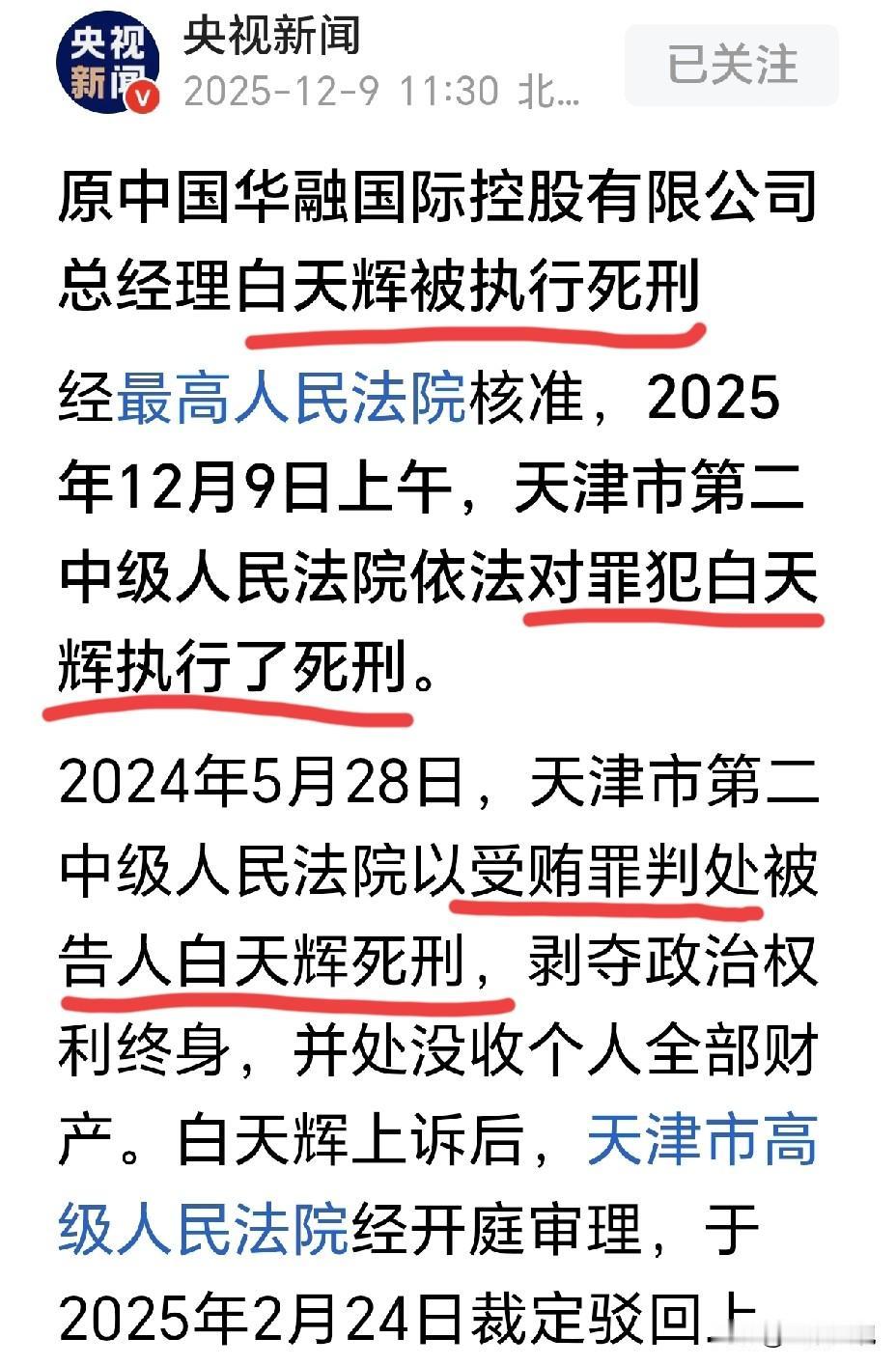 今天又一个受贿罪犯被执行了死刑。 随着2000年广西自治区主席成克杰、江西副省长胡长清这两个中国改革开放以来第一次被判处死刑的省级副省级高官开始,内蒙古政协副主席郑黎平,内蒙呼和浩特开发区“一把手”巨贪李建平,金融系统“第一贪”赖小民,杭州、苏州亿元副市长许迈永、姜人杰,到今天的央企华融高管白天辉,都被立即执行。这每一起死刑判决的背后都蕴含着一个真理:无论职务多高、手段多隐蔽,只要敢触碰法律红线,必然付出沉重代价。 然而,反腐败力度的加大,媒体曝光的“老虎苍蝇”越来越多,给人们一个感觉,那就是:为什么贪污受贿那么多,判处死刑的却极少。 对于普通老百姓来说,几万几十万都是天文数字。一些官员贪污受贿几百几千万、甚至几个亿都不会被判死刑立即执行。一些人认为,受贿犯罪量刑过轻,不判死刑立即执行,是贪污受贿犯罪多发的主要原因,其实这只是一些人的感知。 事实上,受贿犯罪不是越来越多,而是越来越少了。殊不知,国家的反腐败力度越来越大,“不能腐,不敢腐,不想腐”的制度笼子扎得越来越紧密,官员的廉洁服务意识越来越强,社会风气越来越好。 有人说,以前办事只要拿钱,基本啥事都可以办。现在钱也不好使了,不是所有的事都是钱能办到的。不要说你给官员送钱,就是给拿点烟酒,请吃个饭、喝顿酒,一般都会被拒绝。现在纪检监察机关从主抓贪污受贿犯罪,到抓官员的工作作风、八项规定这个变化就能说明问题。 受贿犯罪有它的特殊性,一是隐蔽性高,不易发现。二是从犯罪动机上,故意的成分少,被动的成分大。感知对贪污受贿犯罪处罚过轻的人是对法律缺乏深入的了解。《刑法》是立法机关对各种刑事犯罪的危害性全面认真综合分析研究制订出来的,贪污受贿犯罪相较于故意杀人、纵火、抢劫等重大恶性犯罪,危害性相对较小。对于受贿犯罪起刑点在3万元,300万以上就定为“数额特别巨大”。再者,就是在量刑时有如自首、立功、坦白、积极退赃、犯罪动机、悔罪表现、弥补损失等法定和酌定从轻处罚情节。这就是贪污受贿犯罪很少被执行死刑的原因。 大家对此怎么看?