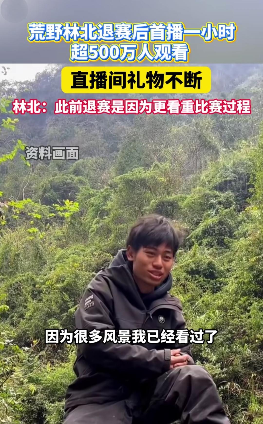 退赛风波后林北一开播就炸了——1小时500多万人挤破直播间,礼物刷得满屏晃眼,这人气里藏着多少人对“不硬撑”的共鸣啊。 他笑着说退赛理由:“就是想陪女友过生日,荒野的风景看够了,比起争名次,自在更重要”。还吐槽钻木取火失败的糗事,那股松弛劲儿,像极了我们想逃开“必须赢”的瞬间。 成年人的世界早被“要结果”捆得死死的:上班要KPI,生活要体面,连玩都得“有意义”。。可林北这一退,像给紧绷的日子开了道缝——原来不用逼自己站到最后,把当下过舒服,也是种赢。 你有没有过“不想硬拼”的时刻?