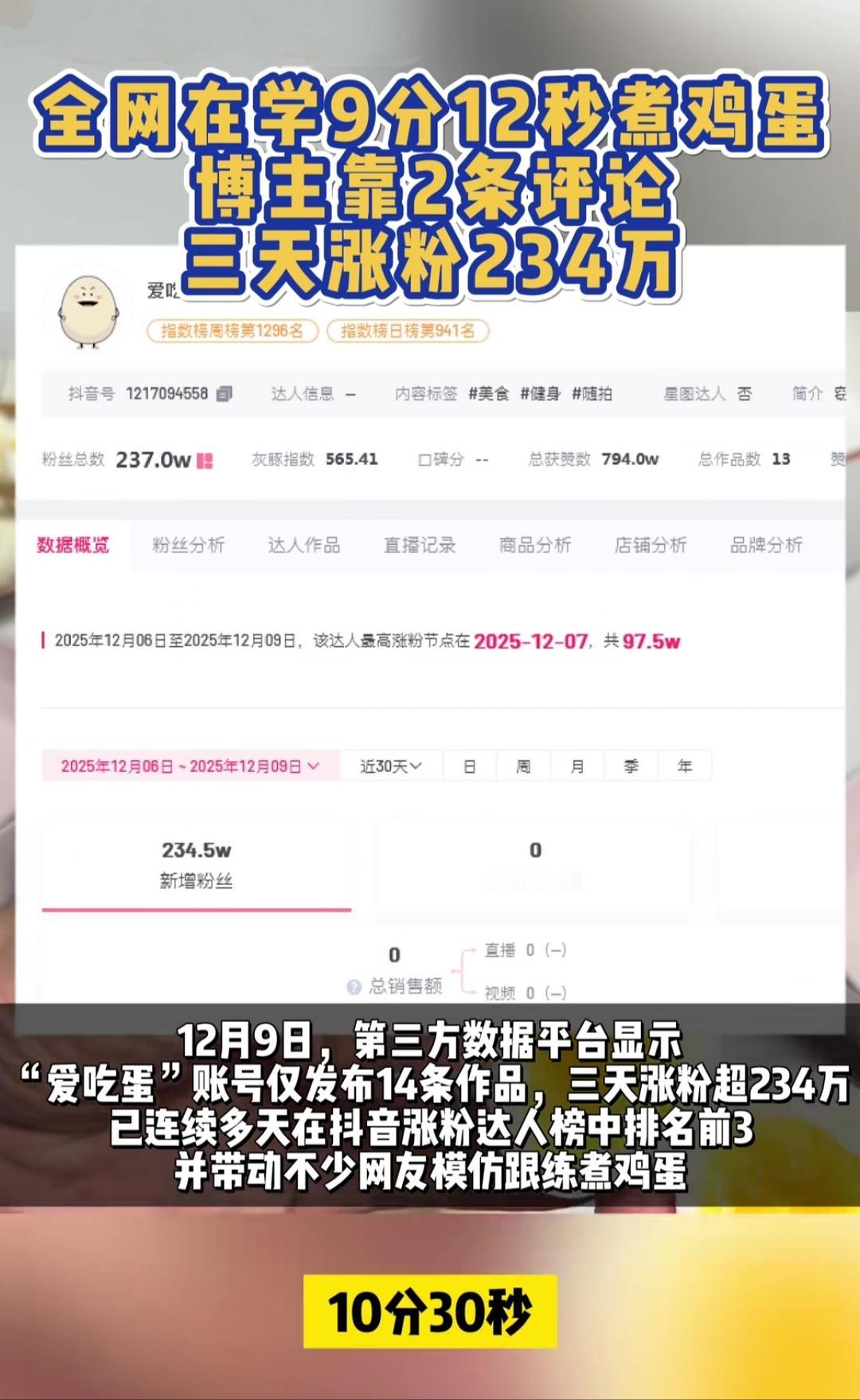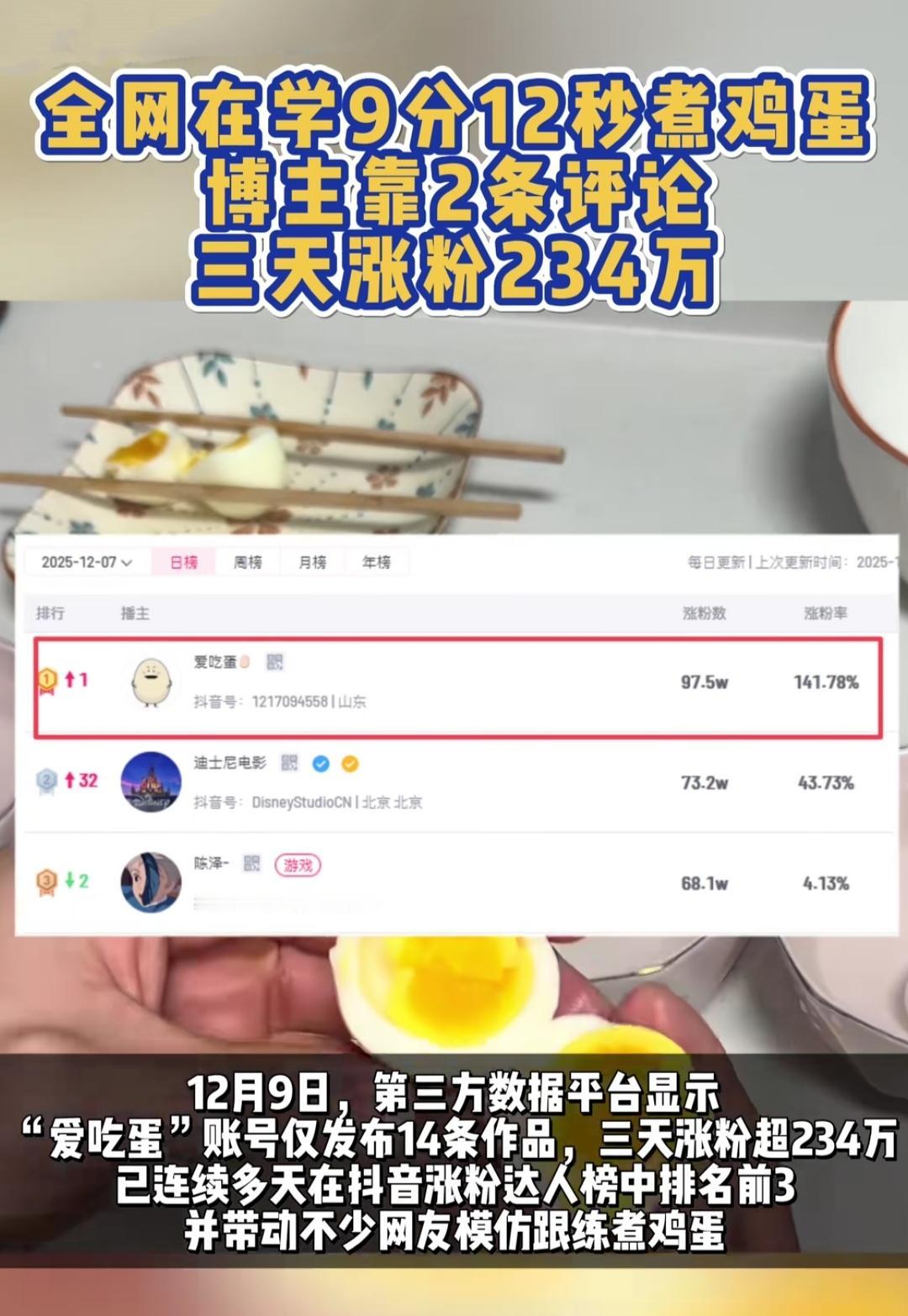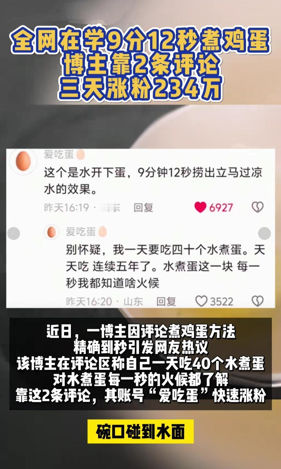 煮个鸡蛋涨粉234万!煮鸡蛋也能封神?这两天全网都在学“9分12秒煮蛋法”,博主“爱吃蛋”靠两条评论,三天涨粉234万,直接杀进抖音涨粉榜前三。 起因是有人晒出完美金沙蛋黄的水煮蛋,评论区吵翻了锅。他冷不丁冒一句:“水开下蛋,9分12秒捞出过凉水”,还补了句“我一天吃40个蛋,连吃五年,每一秒火候都门清”。这话一撂,网友全疯了——照着做的人,剥壳不粘、蛋黄不噎,连煮了二十年蛋的阿姨都喊“开窍了”。 其实咱们厨房哪少过这种“盲盒时刻”?煮蛋不是太老就是太溏,煎鱼不是破皮就是焦糊,那些被“差不多”糊弄的小事,偏偏是日常里最闹心的痛点。他把“随便煮”变成“精准控”,像给普通日子递了把小尺子——原来把小事较真到极致,就是最实在的浪漫。