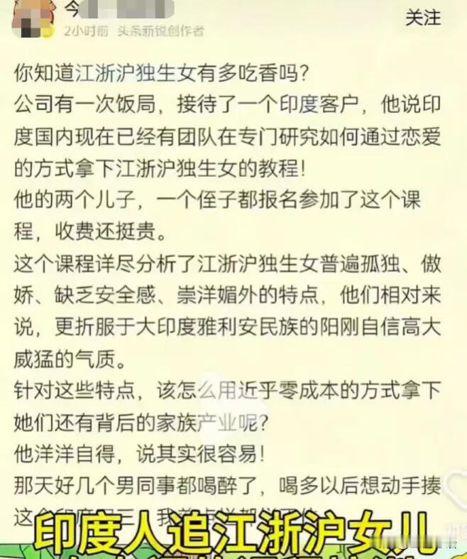 救命!这哪是恋爱班,分明是“围猎局”! 江浙沪姐妹快醒!⚠️ 刷到这个爆料我真的浑身发冷,隔夜饭都要yue出来了!印度居然有专门的“恋爱速成班”,精准瞄准咱们江浙沪独生女,美其名曰教你谈恋爱,实则全程都是算计,把“骗感情、吞家产”明晃晃当成生意来做,真的太恶心了! 据网友爆料,有印度客户吃饭时洋洋自得说,自己两个儿子、一个侄子全报了这个班,学费才几美元到二十多美元,便宜到离谱却火得不行。课程内容细得吓人,把江浙沪独生女的特点扒得底朝天——从小被富养、家里资产丰厚,大多是独苗,承载着几代人的积蓄,可偏偏因为成长环境,容易缺安全感、心思软、重视家庭。这些本是温柔善良的特质,竟被他们扭曲成“好拿捏”的软肋,当成“攻略突破口”。 更恐怖的是,这根本不是简单的约会技巧,全程就是一套“捕猎流程”:教你在社交软件精准锁定目标,用现成的温柔话术伪装绅士,靠刻意倾听制造情绪价值,一步步让女孩依赖,再诱导结婚,最后想方设法侵占对方家产。甚至有爆料说,有人靠这套套路离婚,直接分走了中国妻子1300万资产,简直刷新底线! 我真的想掏心窝子劝各位江浙沪姐妹,还有所有家境优渥的女生,谈恋爱千万别恋爱脑!不是否定跨国感情,而是这种带着明确功利目的的套路,真的防不胜防。别被几句甜言蜜语、一点刻意的体贴冲昏头脑,一定要多观察、多了解,看清对方的真心,而不是被对方精心打造的“人设”骗了。 感情是双向奔赴的真心交换,不是一场处心积虑的算计。那些把你当“金矿”的人,再温柔也藏着獠牙,一定要擦亮眼睛,别让自己的真心和家产,都成了别人的“战利品”😭