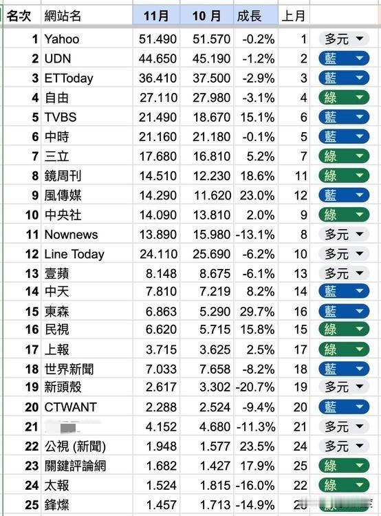 台湾新闻网站谁最红?11月岛内媒体流量出炉,看蓝媒绿媒如何较劲。中立雅虎排第一,这家绿媒网站位处末位! 雅虎新闻门户网站在岛内以中立著称,其主要内容是汇聚各大新闻网站即时热点资讯,不分蓝绿和颜色,本次位居第一。 联合报旗下的联合新闻网作为蓝媒不仅位居蓝绿新闻网站之首,也仅次于雅虎,位列第二,超越“造谣报”自由时报。 TVBS作为蓝媒超越以造谣、抹黑为己任的三立流氓台,前者流量排在第五位,后者排第七位,甚至位列旺中集团的中时后一位。 中天网络频道竟然超越绿媒东森,分别排在第14位和第15位。 但是下列表格中,所标注的蓝媒与绿媒是否精准,也有争议。比如Nownews,政治立场偏绿,难以说是多元。东森是彻底绿媒,也被划入蓝媒令人傻眼。壹蘋新闻网,脱胎于原苹果网,立场亲绿,算不上多元。而新头壳虽比自由时报相对克制,但与联合报、中国时报的观点完全对立,是不折不扣的绿媒。不知各位对表中蓝媒绿媒的区分是否认可,敬请补充!