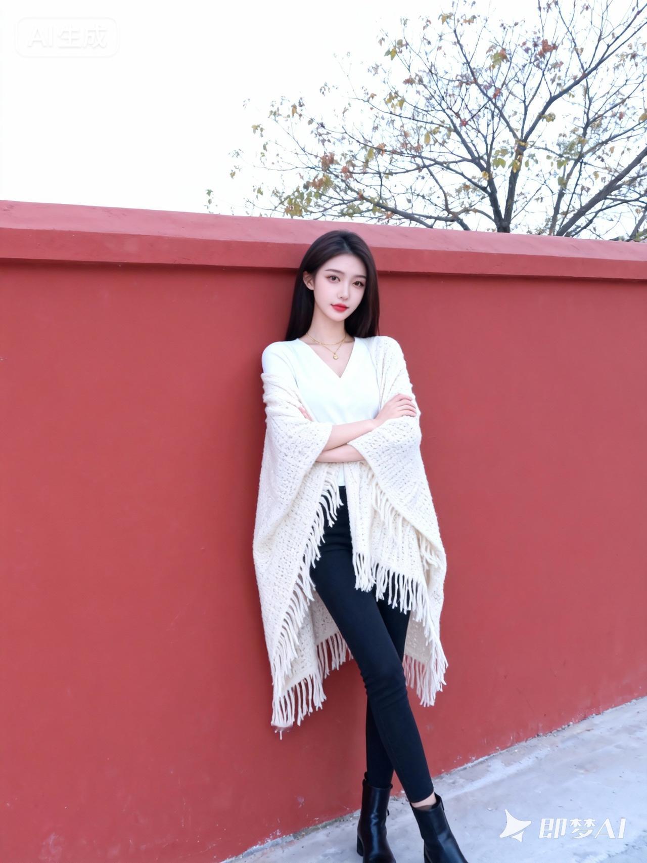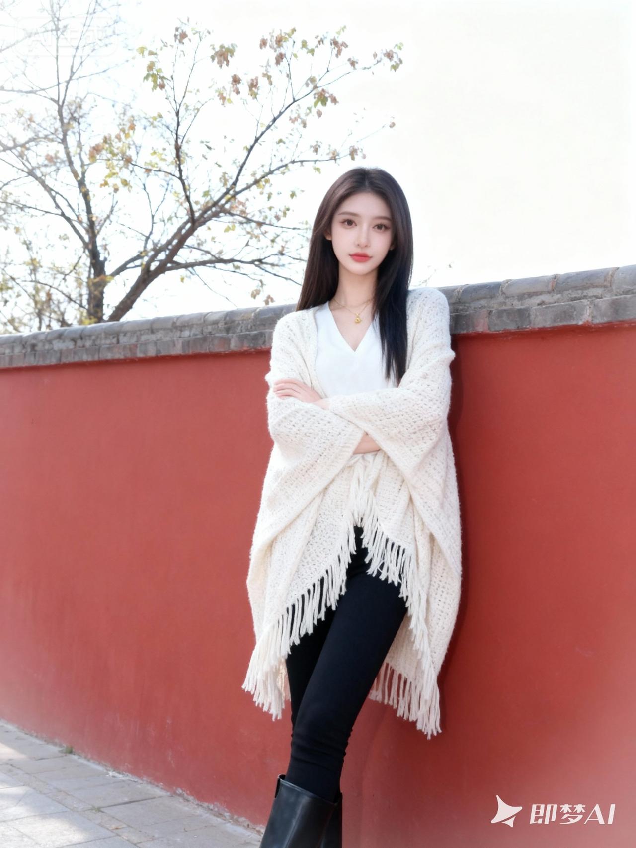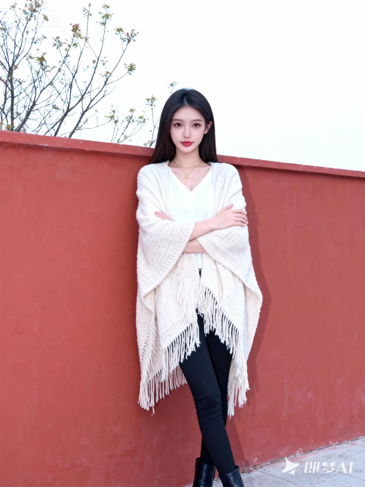 这位女性妆容清透淡雅:她涂着显气色的淡红色口红,底妆自然服帖,眉眼修饰得精致柔和,整体妆容简约又不失精致;她的深色头发是自然的直发,柔顺地披在肩头,身着一件白色V领内搭,外搭一条米白色的流苏针织披肩,搭配黑色紧身裤和黑色短靴,颈间戴着一条细巧的金色项链;她双臂交叉抱在身前,身体轻靠在红色的墙边,姿态放松又带着一丝从容;她的神态平静温和,眼神自然地看向镜头,带着淡淡的疏离感;背景是户外的红色墙体,后方是带着稀疏枝叶的树木,天空明亮柔和,整体滤镜是清新自然的冷白色调,带着轻微的柔焦效果,让画面充满了安静闲适的春日氛围感。