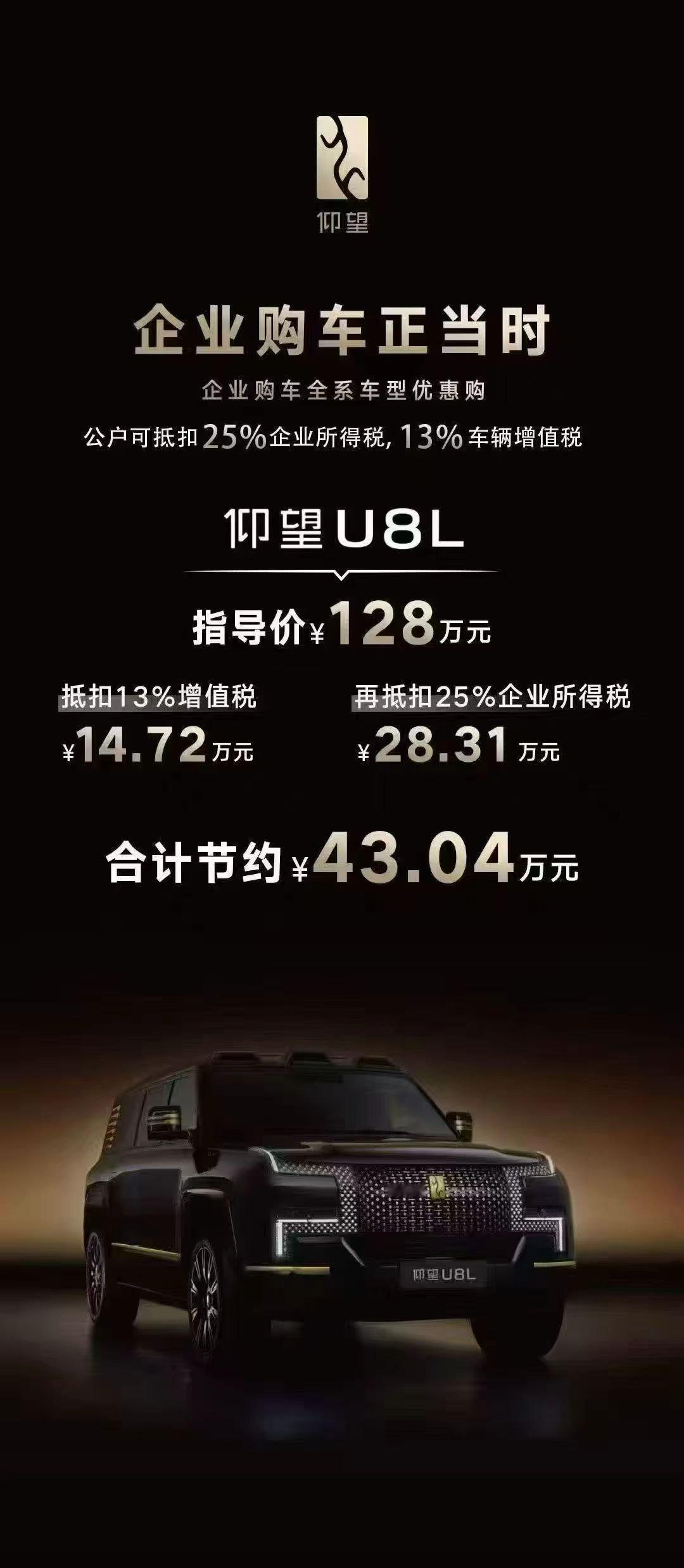 要是企业买 原来可以抵扣43.04万的税按这个算法, 这事儿,当初把仰望U8L、蔚来ET9、极氪009光辉、尊界S800等等分别买一台,不就没那么多事儿了吗?要是还不够,两两组合学翔翔测一下,再买,流量、合理避税啥都有了,是不是?