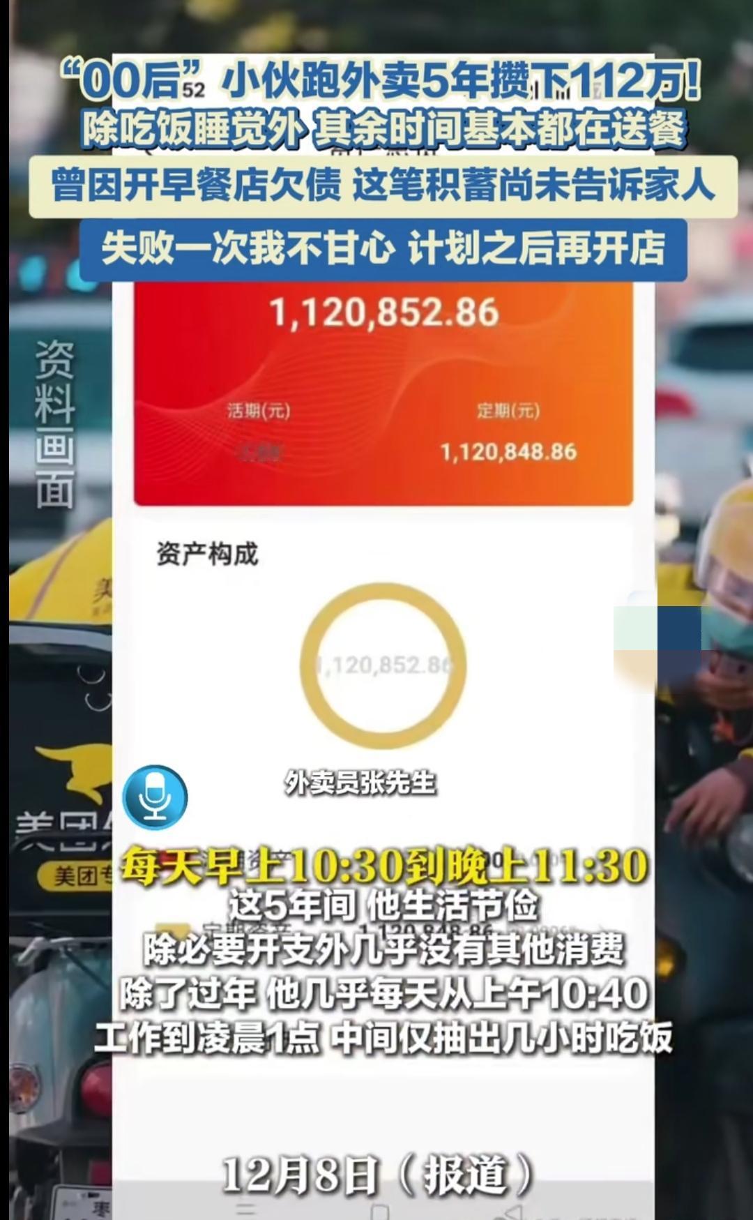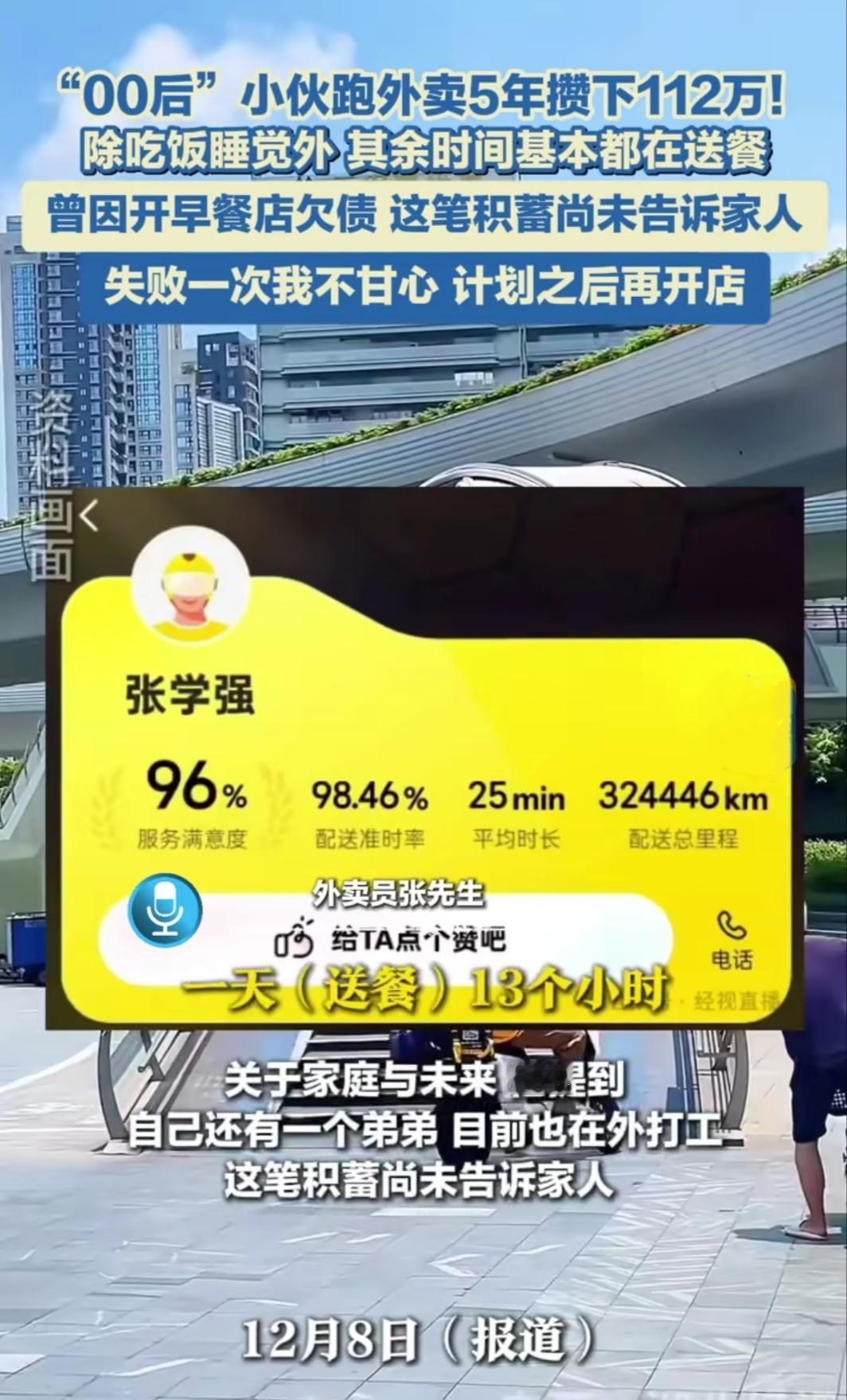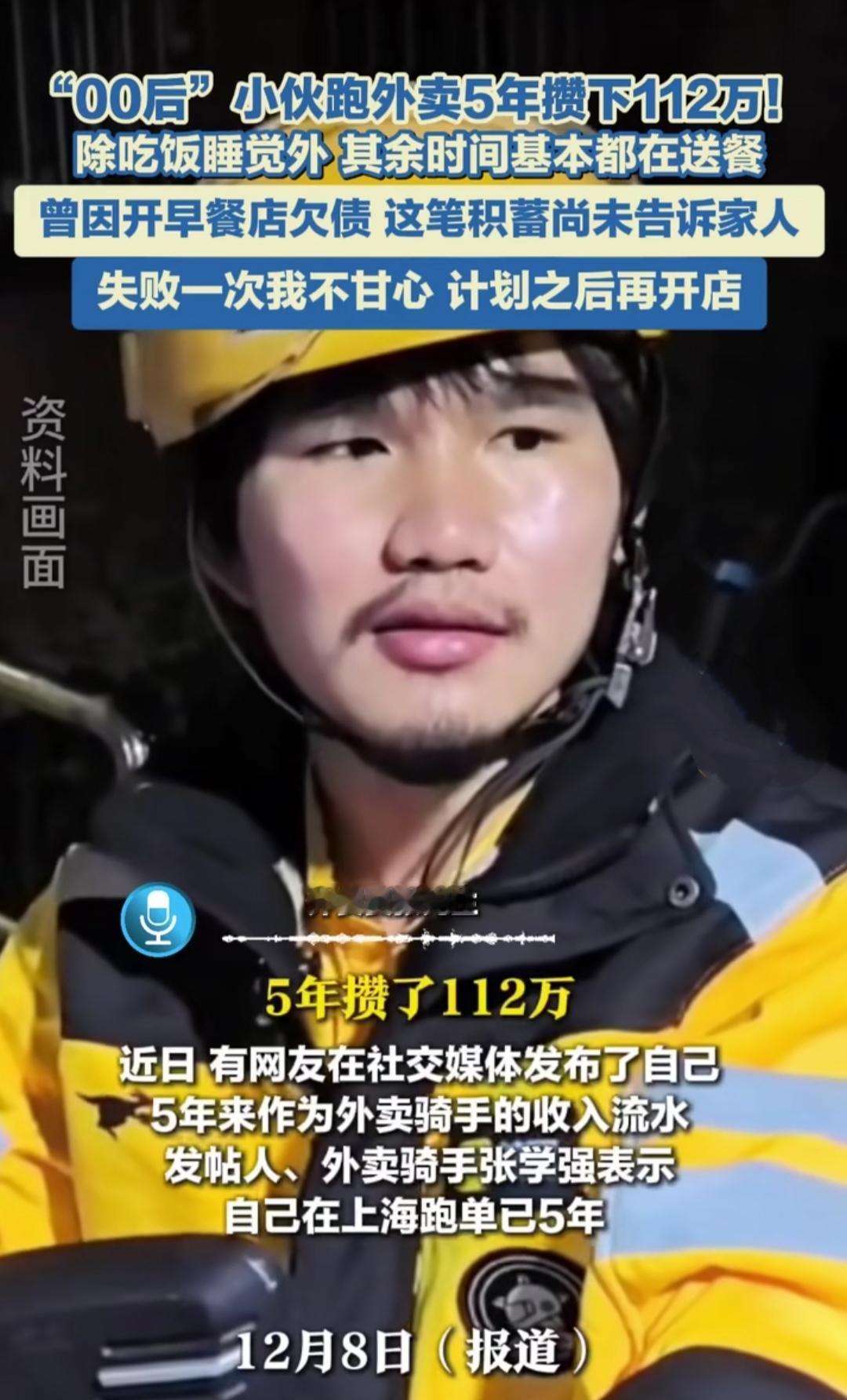 25岁福建小伙张学强,跑外卖5年攒下112万的新闻刷爆全网,看完没人不感慨。这不是凭空掉的好运,每一分钱里都裹着凌晨街头的寒风,藏着不敢停歇的脚步,是普通人实打实拼生活的模样。 他5年前在老家开早餐店亏了5万,背着债务去上海当骑手。5年里日均送83单,累计跑单近16万,配送里程能绕地球8圈,每天从上午10点40忙到凌晨1点,站点没人见过他走路送餐,永远在小跑,“单王”的称号是靠汗水堆出来的。 生活上他过得极致节俭,住6平米的合租房,月租2000元,日均花销仅100多,不买50元以上的额外物品,连续5年春节都不回家,就为多赚点节假日补贴。普通骑手淡季月入不足5000,他上个月跑1500单赚了2.3万。 这份高收入背后也藏着无奈,没有社保和公积金,全是用时间、体力换的。如今他计划用这笔积蓄再开早餐店,把跑出来的底气变成安稳营生。普通人的逆袭从没有捷径,不过是把别人扛不住的苦,熬成了自己的路。