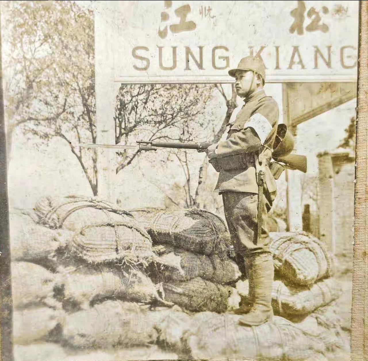 这是一张日军站岗图。这是日军占领松江火车站后拍摄的一张照片。很多人可能认为这只是一张普通的照片。但是我们通过这张照片可以看出日军站岗的细节,日军站岗的时候是不会把步枪背在后面的,反而是把步枪夹在身体的中间,横着步枪站岗,所以我们的很多电视剧都演错了。通过这个细节的考据,希望以后日军站岗不要再像电视剧那样背着枪。
