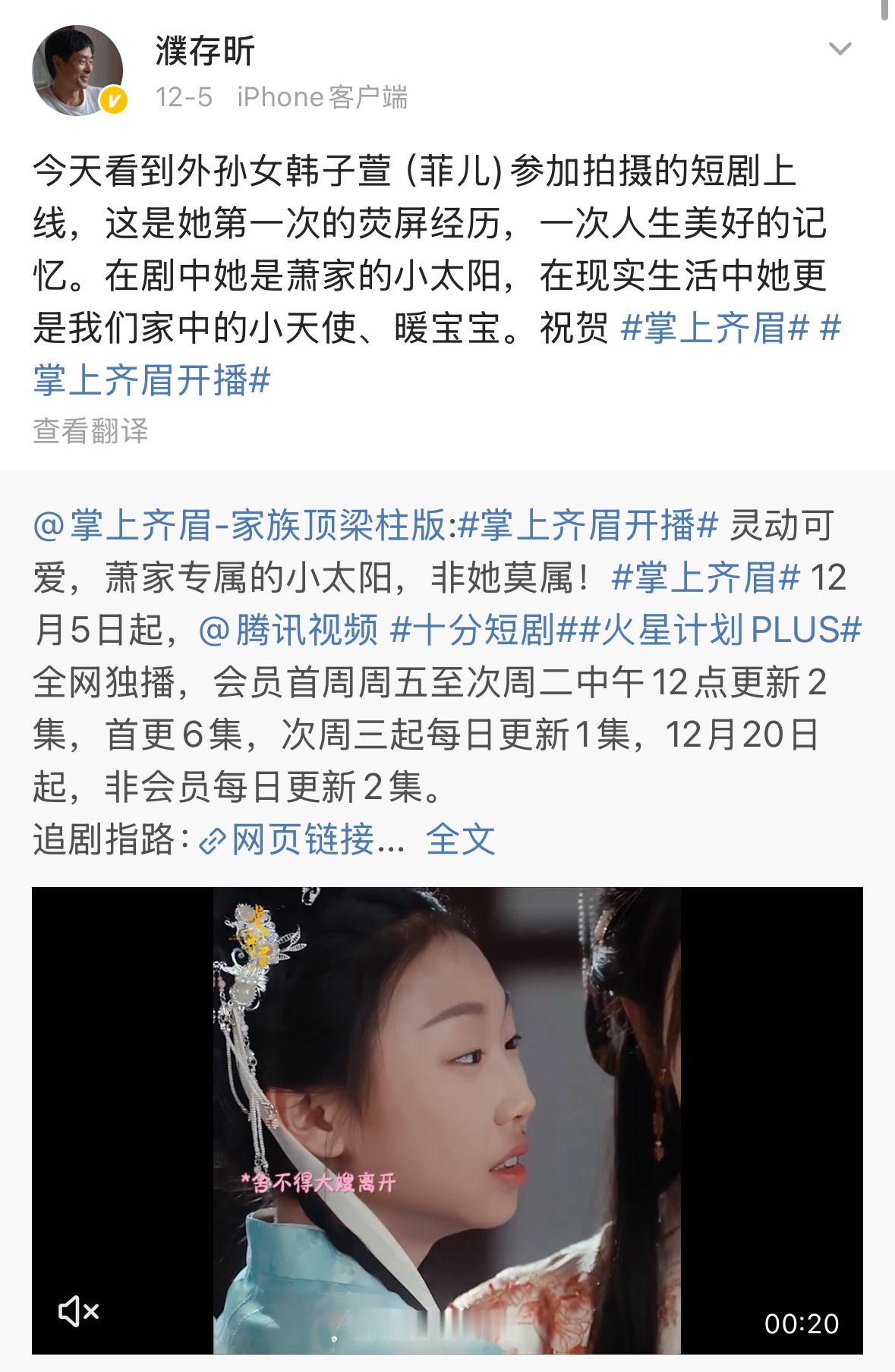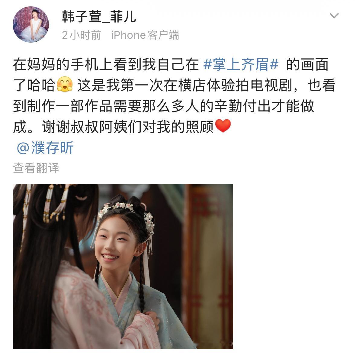 濮存昕外孙女回应拍戏:“这是我第一次在横店体验拍电视剧,也看到制作一部作品需要那么多人的辛勤付出才能做成。谢谢叔叔阿姨们对我的照顾”5日,濮存昕曾发文帮外孙女宣传新剧濮存昕外孙女出道濮存昕外孙女韩子萱回应拍戏