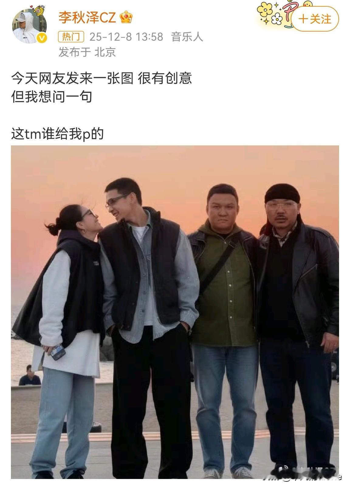 近日,一位不知名音乐人李秋泽发文说:“今天网友发来一张图,很有创意。但我想问一句,这谁给我P的?” 李秋泽是一名嘻哈歌手,他曾与李嘉格前夫车澈合作过说唱节目。 这张图上有4人,分别是李嘉格、小董、李秋泽和车澈。网友真是太有才了,把他们4人P在一起。 现在最幸福的是李嘉格,她与小男友一起滑雪、健身、跑步,每一天都过得很开心。 小男友年轻帅气,而且会做饭,比车澈好看多了。 车澈虽然不差钱,但现在已是孤家寡人,哈哈哈。 大家看过这张图片吗?