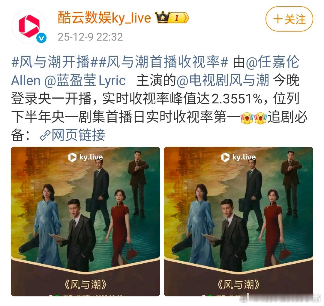 任嘉伦风与潮开播,开局只有三广但酷云收视率直接破 2 了