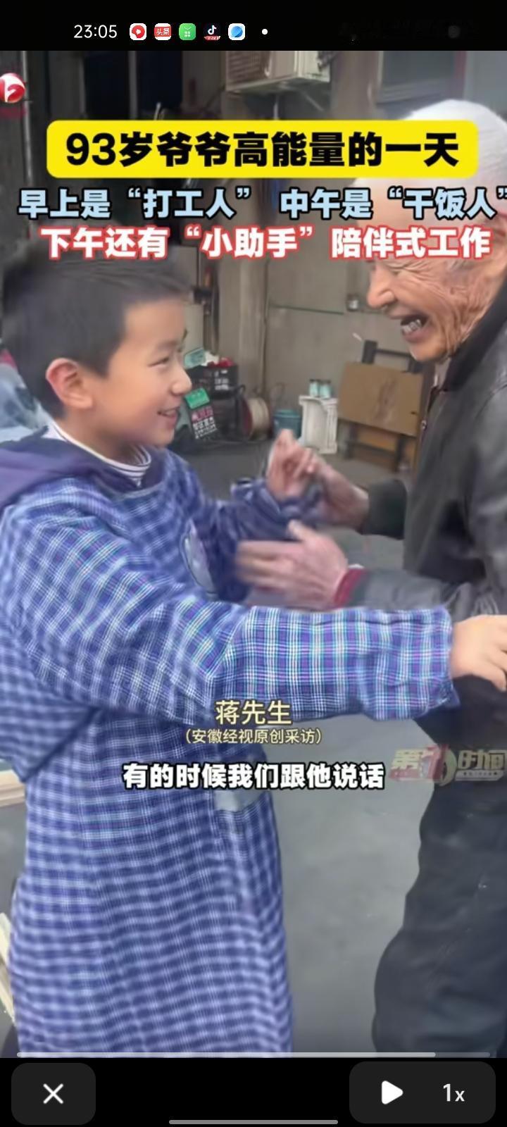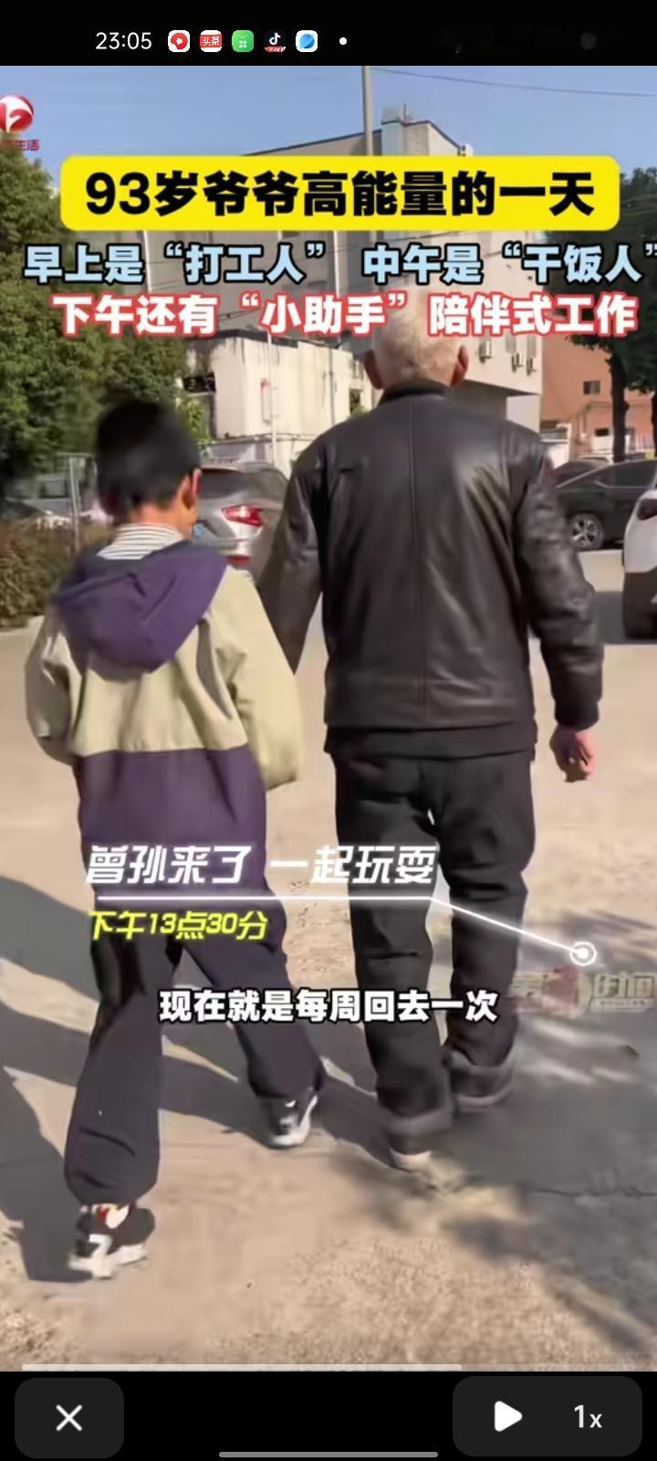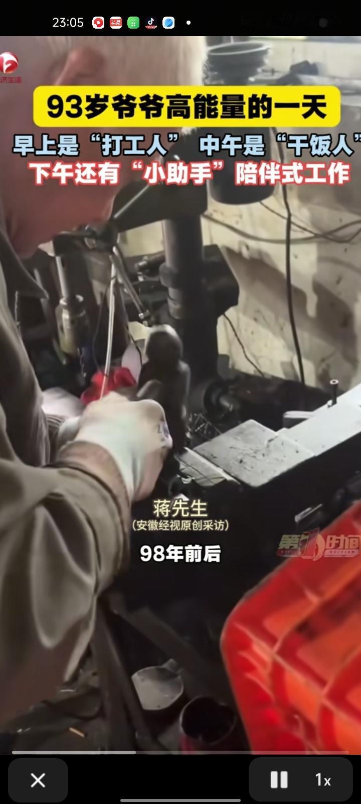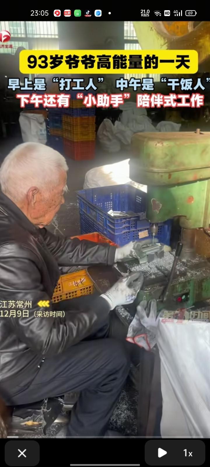 12月9日,江苏常州。网友晒出93岁爷爷高能量的一天,早上是打工人,中午是干饭人,下午还有小助手陪伴式工作。蒋先生表示,爷爷年轻时先去上海打工,回家乡之后就一直在当地的电梯厂做钳工,98年前后买了两台冲床,跟家人一起创业,一直到现在。孩子上学后现在就是每周回去一次看看爷爷,可能因为经常做这些冲床声音很大,他现在耳朵不太好了,有时候跟他说话他都听不太清,曾孙一喊他,他就听见了。