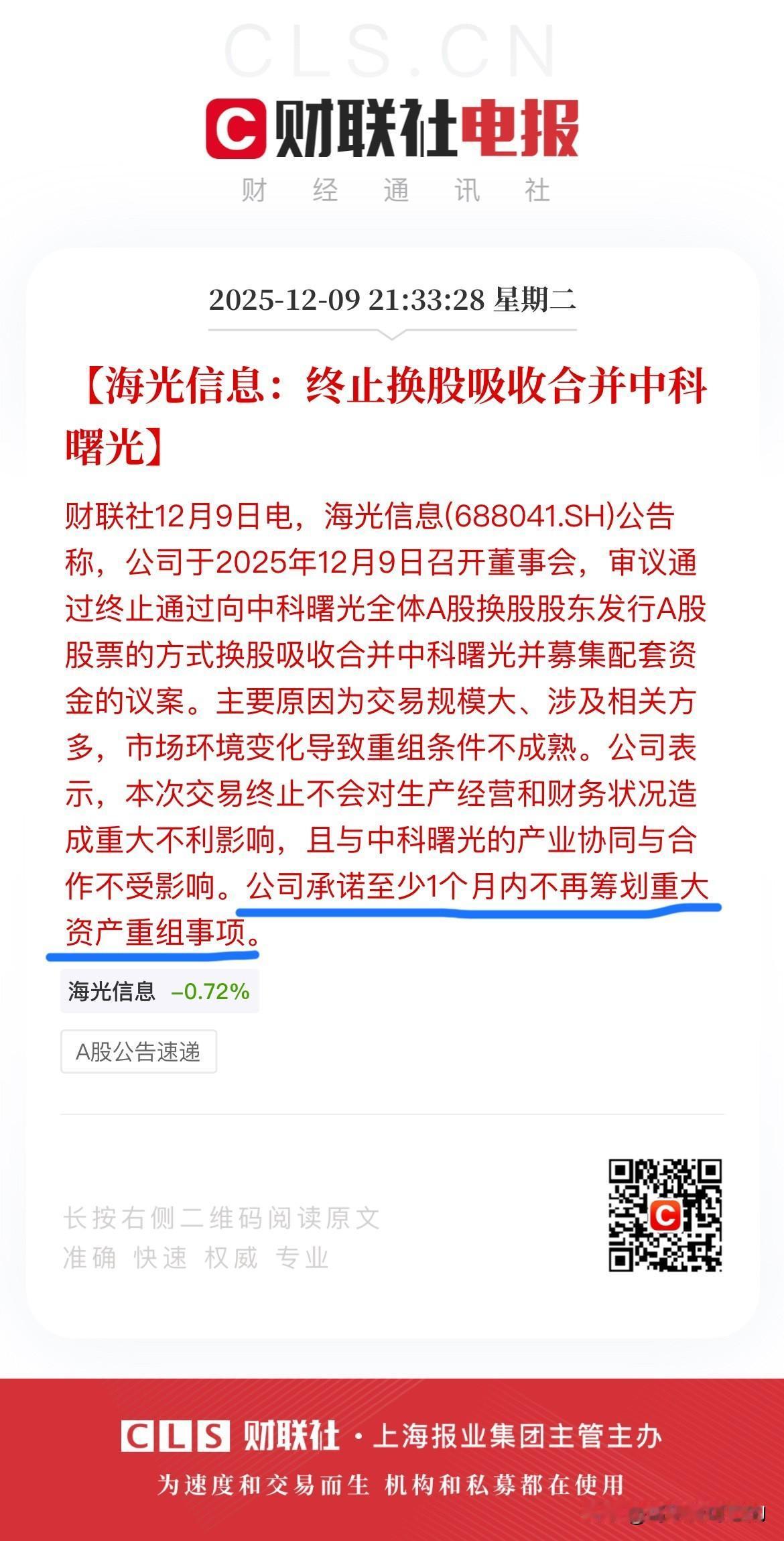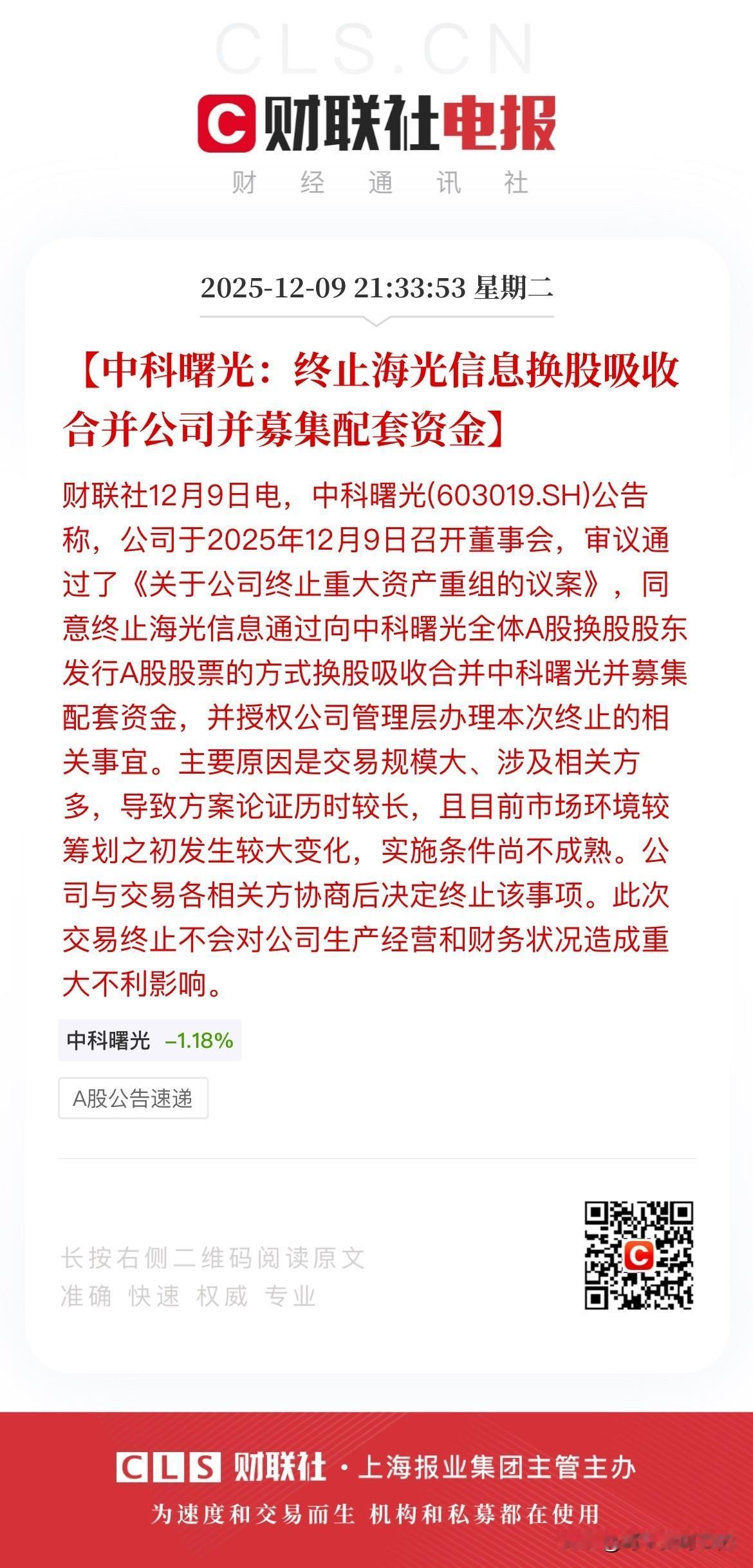 深夜利空来袭!海光信息终止换股吸收合并中科曙光! 就在刚刚,海光信息与中科曙光同时发布了吸收合并终止公告,可以确信是真消息,而并非是市场谣言! 至于终止的原因则是说是因为本次交易规模较大、涉及相关方较多,使得重大资产重组方案论证历时较长,目前市场环境较本次交易筹划之初发生较大变化,本次实施重大资产重组的条件尚不成熟。 总之,这海光信息和中科曙光联姻这事儿就到此为止了!不过海光信息最后还表示一个月内不会再进行重组,这一点倒是值得大家细品! 两家联姻就这么突然终止了,但是明天的算力板块可能就要倒霉了。毕竟这两家中海光信息市值5000亿,而中科曙光市值也是过千亿,绝对是国内算力的龙头企业。本以为在吸收合并成功后会组成国内的算力巨头,没想到如今却是草草收场,倒是有些让人唏嘘。 虽然两家合并终止了,但是持有两家公司的股民似乎并不需要太担心,因为虽然两家公司今年都有较大涨幅,但是那都是在确定重组后几个月之后才上涨的,也就是说他们的涨幅并不来源于重组的利好消息! 因此各位股民请不要太过恐慌,千万别轻易丢了筹码!