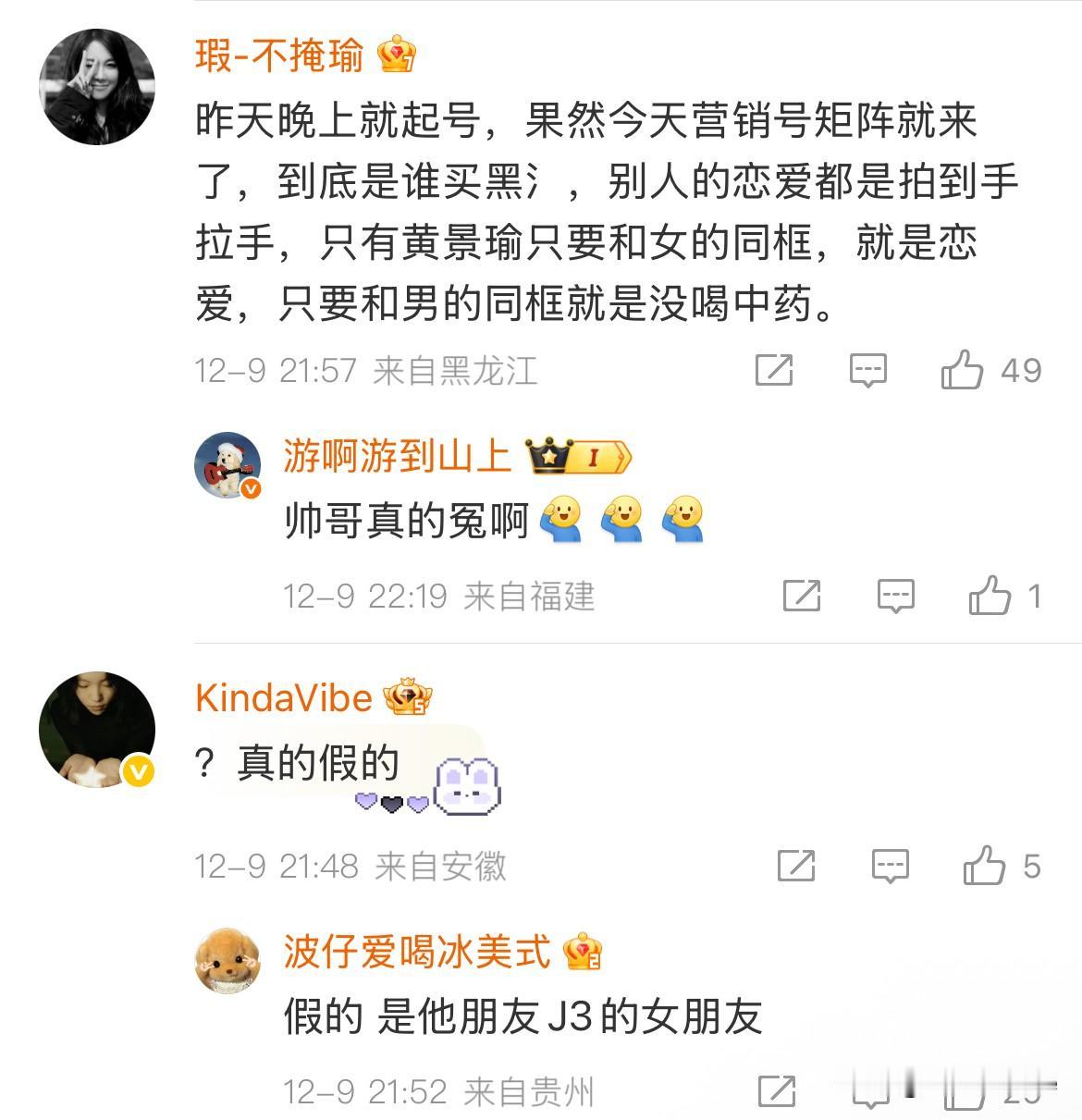 12月9日,怎么还有人不知道黄景瑜离婚了? 单身30➕男性身边有女性出现就是女友么? 有网友跟娱记爆料黄景瑜疑似有新恋情,对方是一个黑长直女生,遭到黄景瑜粉丝反驳,称所说的黑长直女生是黄景瑜好友的女朋友,并非黄景瑜新女友! 我想说是又如何?不是又如何?艺人恋情公开了讨论讨论无可厚非,没公开只是网友三言两语的揣测就没必要讨论了! 对于黄景瑜,我最近看现在就出发很喜欢他,有公开恋情就祝福,没有就看看他的综艺 他跟金晨属于综艺cp,不是现实情侣!