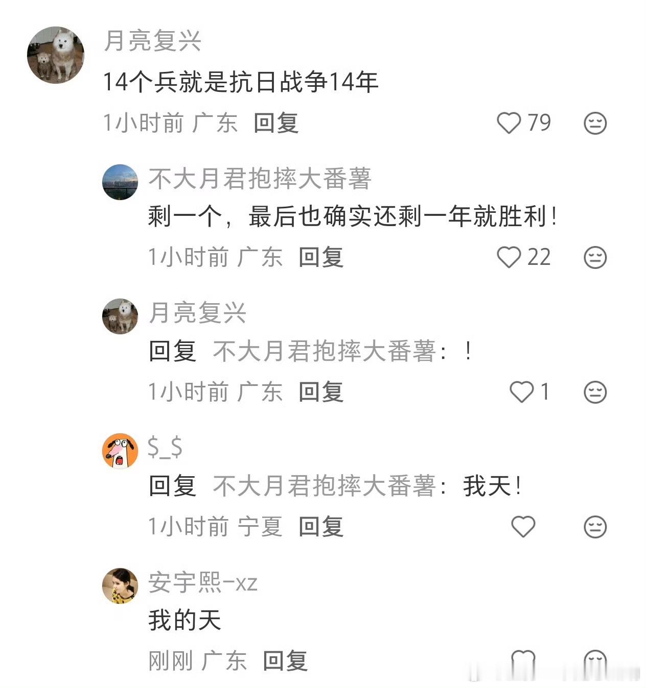 呐呢,14个兵是抗战14年,最后只有康灵宝1个活下来了