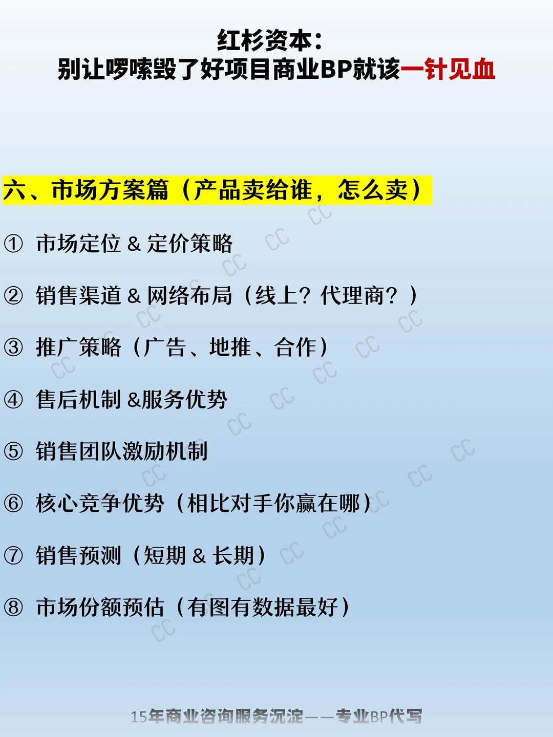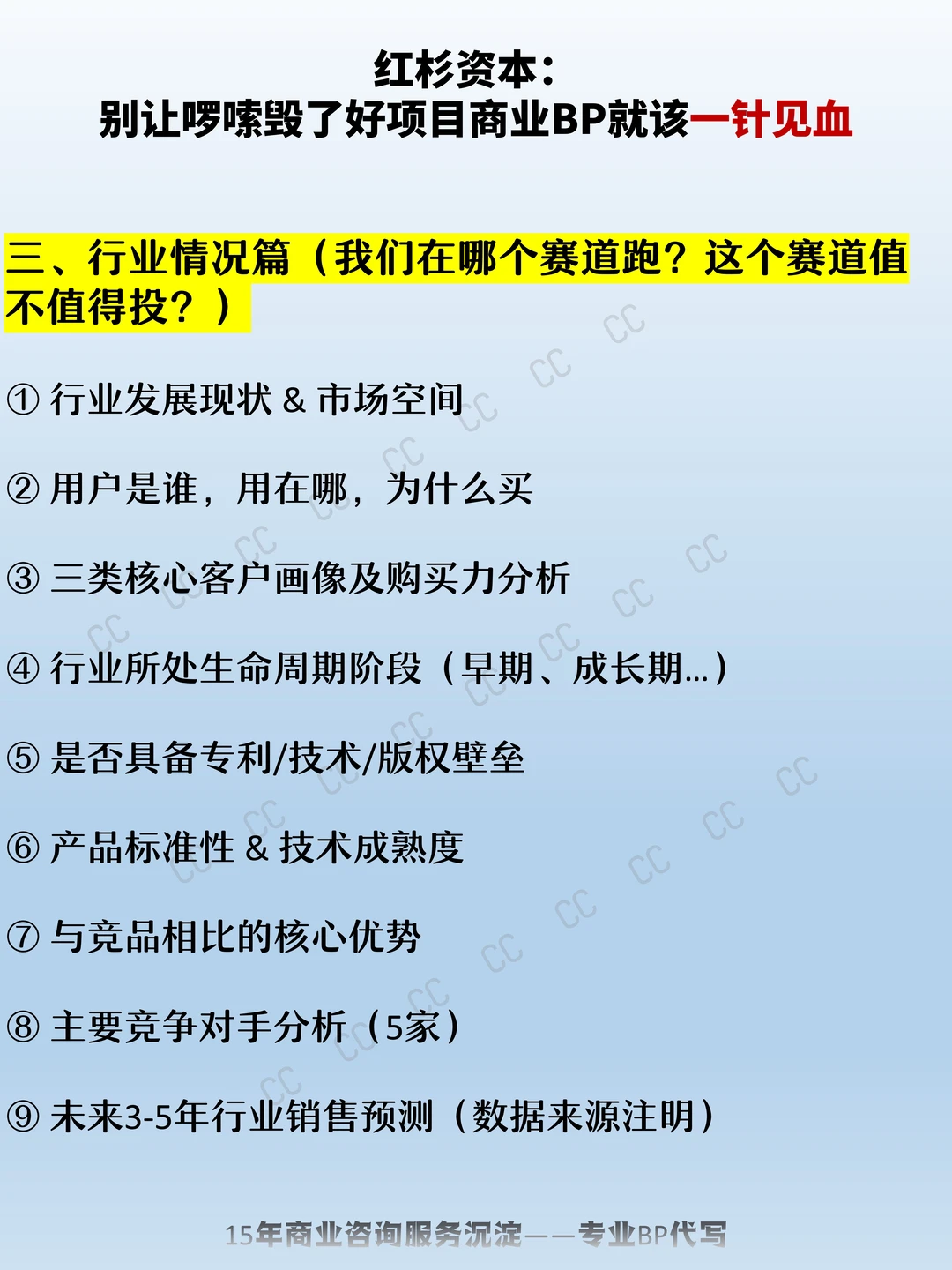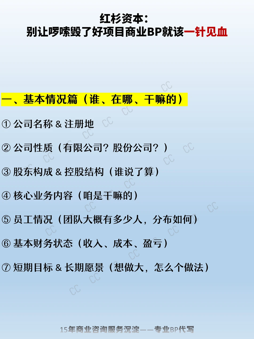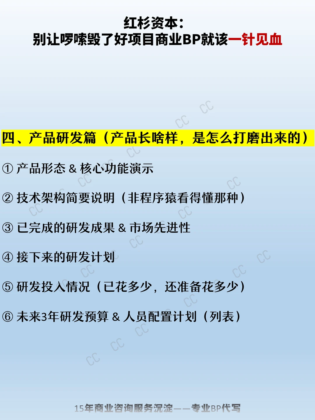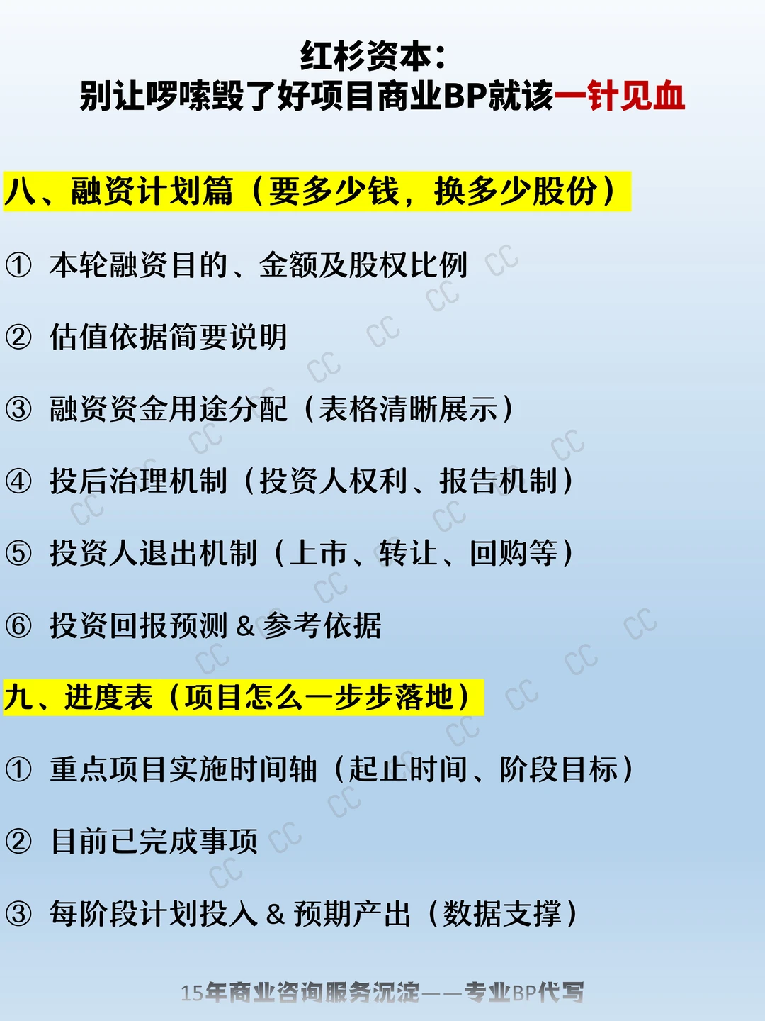 一、基本情况篇(谁、在哪、干嘛的) 二、公司管理篇(谁在带队,怎么带) 三、行业情况篇(我们在哪个赛道跑?这个赛道值不值得投?) 四、产品研发篇(产品长啥样,是怎么打磨出来的) 五、产品制造/运营篇(怎么落地,成本如何控) 六、市场方案篇(产品卖给谁,怎么卖) 七、财务状况篇(数据说话,看得懂的账本) 八、融资计划篇(要多少钱,换多少股份) 九、进度表(项目怎么一步步落地) 创业 商业模式 商业计划书 商业BP 商业BP代写 BP代写 商业计划书代写 融资方案