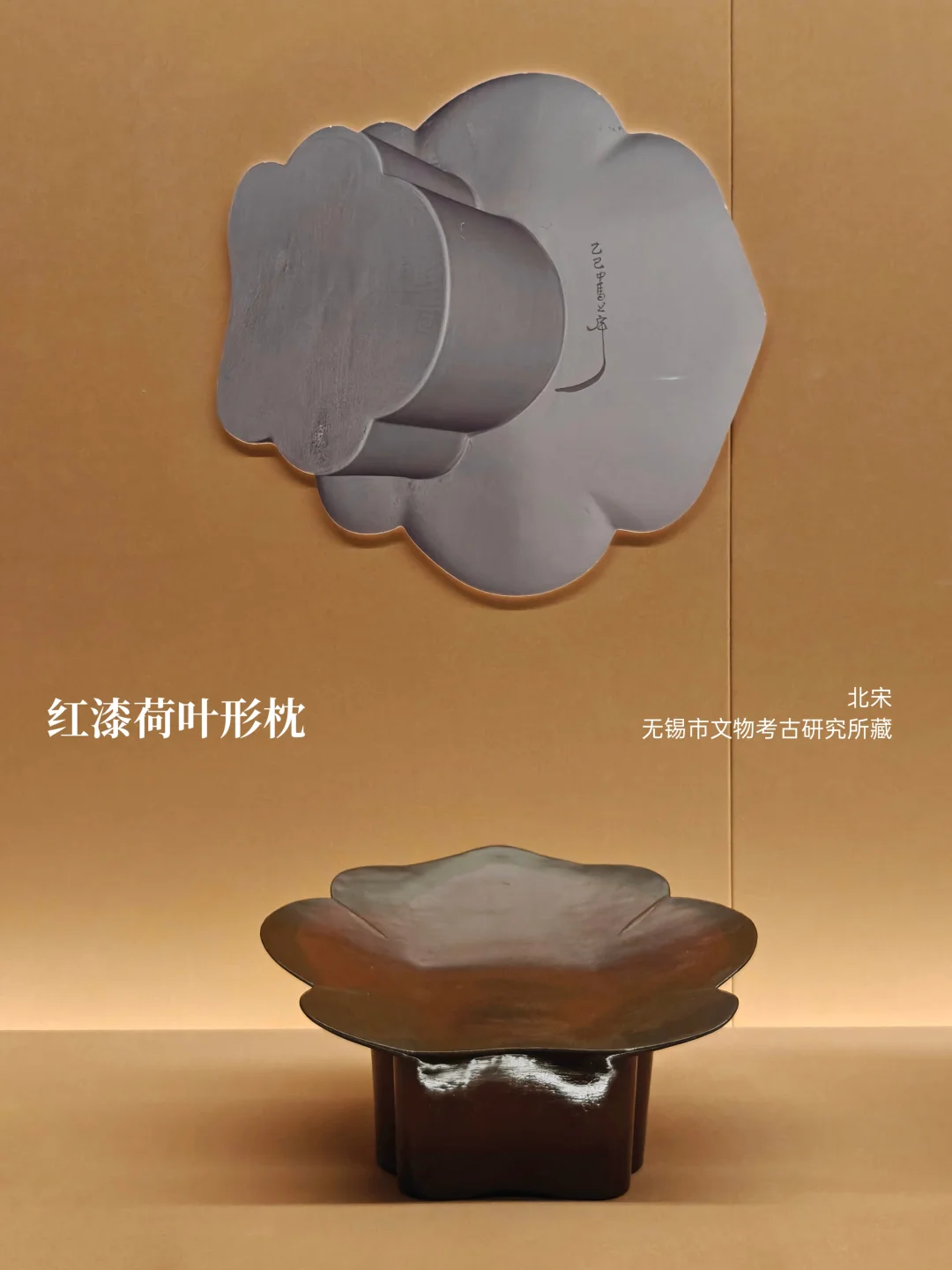 通体髹红漆,漆面光亮。枕面为七瓣荷叶形,底座为五瓣荷叶状。