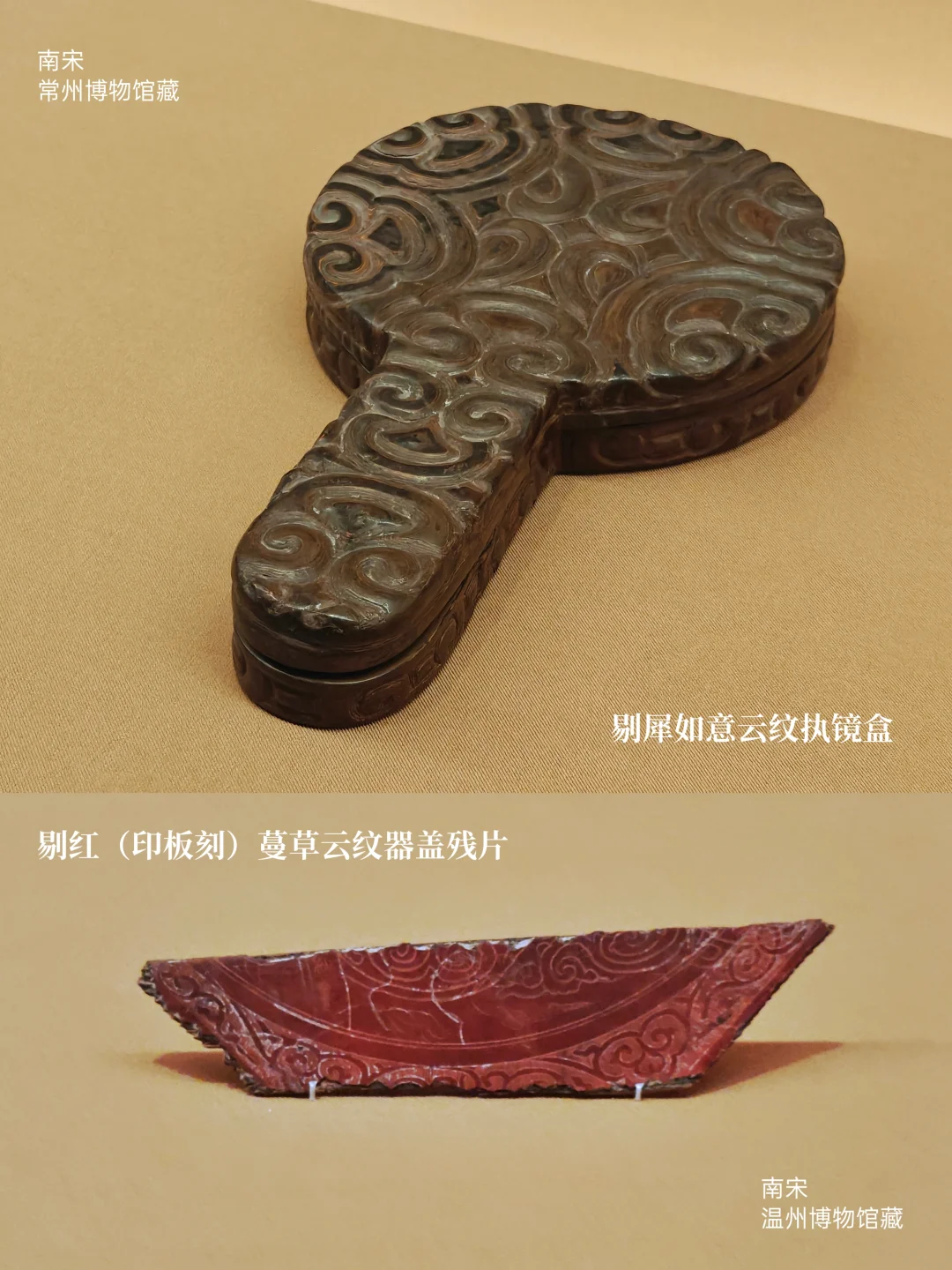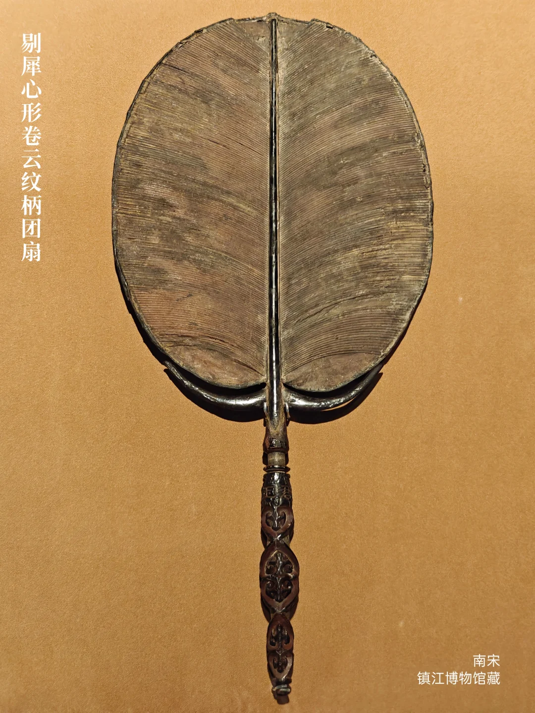 宋代剔犀工艺巅峰之作。扇柄由脱胎和剔犀两种工艺制成,形成透雕效果,心形卷云纹部分可以绕扇杆自由转动。