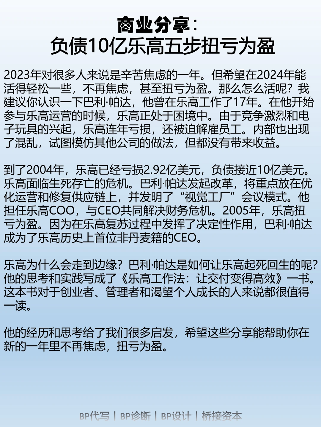 到了2004年,乐高已经亏损2.92亿美元,负债接近10亿美元。乐高面临生死存亡的危机。巴利·帕达发起改革,将重点放在优化运营和修复供应链上,并发明了“视觉工厂”会议模式。他担任乐高COO,与CEO共同解决财务危机。2005年,乐高扭亏为盈。因为在乐高复苏过程中发挥了决定性作用,巴利·帕达成为了乐高历史上首位非丹麦籍的CEO。