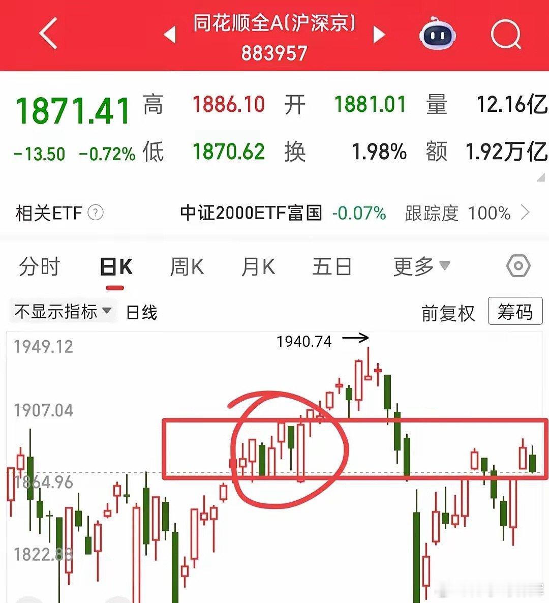 预计明天量化又要使坏了……今天全A的收盘价不大给力,回踩昨日的低点,结果不小心给踩破了,尾盘反抽也没有站上来……这种收盘点位怎么去形容呢?就像卖水果,本来水果品相很好,不管价格贵不贵,大家都愿意买,但是傍晚水果有点烂了,这时候顾客就不想再买了,甚至会有人等这样的残果打折!一般我们都会把这种残果挑拣出来,送给环卫工人或者那些老年人,也不会打折出售,一旦打折出售,就会有更多的人加入这样的队伍那么今天的点位就是这样,收盘点位有点烂了,那么今天尾盘就没人愿意买,反抽都无力,那么明天开盘也不会有人买,因为明天还有人想等打折再买,这就会造成开盘低开!但是量化就是设置的程序,它会设置在哪里买呢?看全A应该就是1866点附近!目前回调,其实就是在洗左边那一坨套牢盘,洗干净就好了……