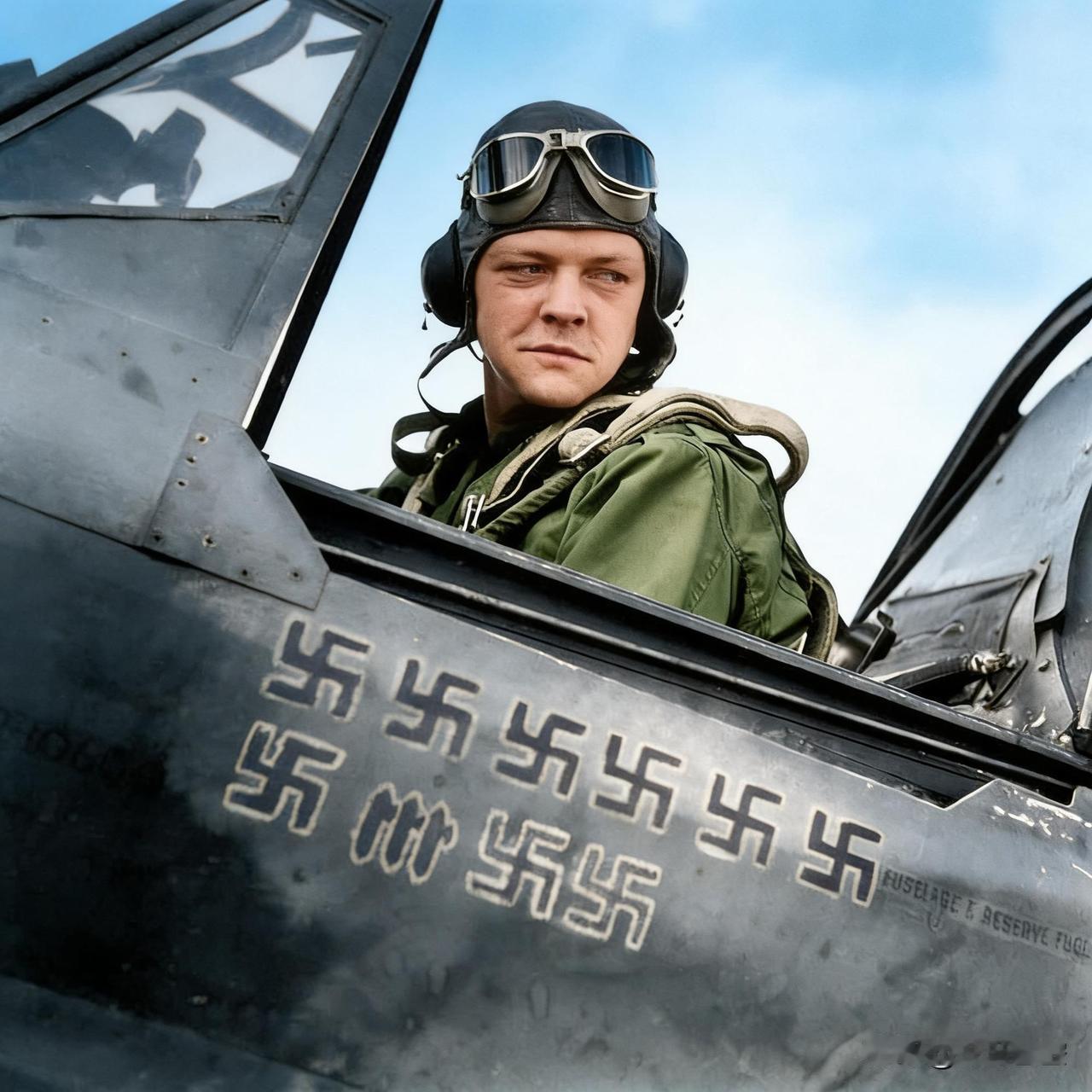 1943年,突尼斯,一位美国王牌飞行员。他的战机座舱旁涂有击落敌机标志,包括9架德国飞机和3架意大利飞机。 美国王牌飞行员 军事 军迷发烧友 历史 历史老照片 二战 美国 突尼斯
