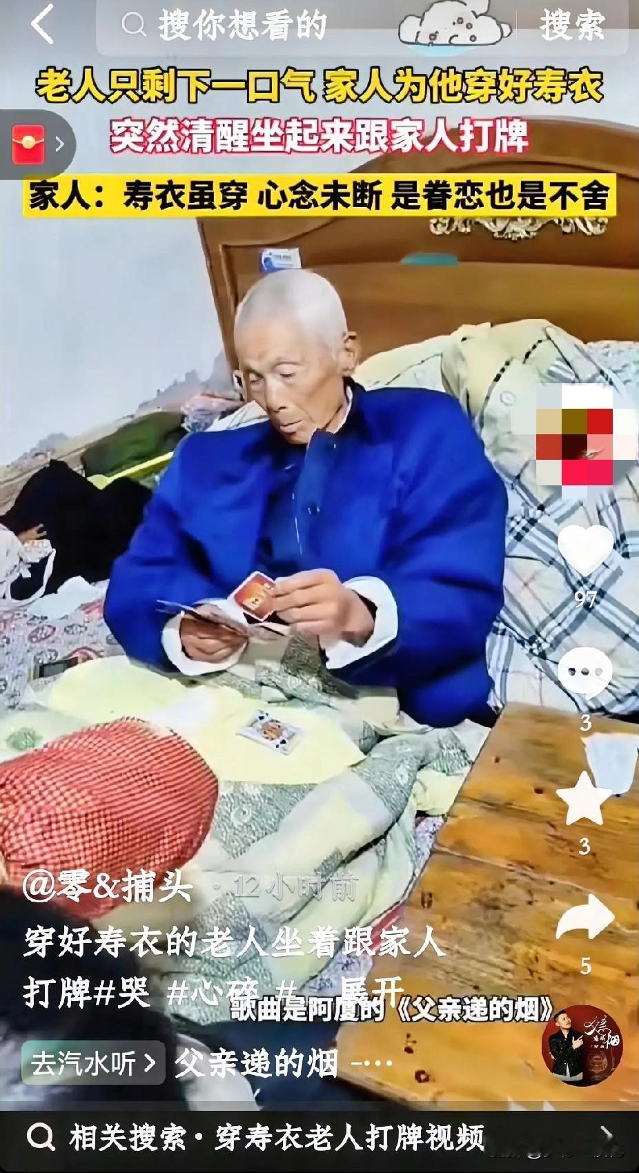 寿衣加身仍要打牌!八旬老人弥留之际的“倔强”,藏着最暖的人间烟火 近日,一则视频在网上刷屏:北方小城一位86岁的张老爷子,因重病奄奄一息,家人含泪为他穿上寿衣准备后事,可就在大家以为老人即将离世时,他竟突然坐起,清晰地说“想打几圈牌”。家人又惊又喜,立刻摆上牌桌,穿着寿衣的老爷子坐在桌前,出牌稳准狠,儿孙们围在一旁,哭着笑着陪他打完了这局特殊的牌。 这一幕既心酸又温暖。据家人讲述,老爷子卧床近半个月,身体早已被病痛掏空,医生早已告知准备后事。寿衣刚穿好的那一刻,他却突然深吸一口气,眼神从浑浊变得清亮,撑着床沿坐了起来。没有交代遗言,没有索要吃食,唯独惦记着和家人打牌——这是他一辈子的爱好,也是他对人间最朴素的眷恋。 视频传到网上后,网友们纷纷被这可爱的老爷子逗乐,也被这份亲情打动:“这是给自己穿了件‘复活甲’啊,阎王爷来收人都得绕道走”“牌瘾大到连死神都拦不住,打完这局起码能再活二十年”。调侃的背后,是大家对老人生命力的赞叹,更是对这份“心念未断”的共情。 其实这并非什么“玄学奇迹”,而是生命最真实的模样。支撑老人撑下去的,从来不是昂贵的药物,而是对家人的不舍,是对“打牌”这份日常乐趣的执念。对老人而言,寿衣虽穿在身,可心里的烟火气还没散:想和儿孙热热闹闹待一会儿,想摸一摸熟悉的牌面,这份简单的念想,成了对抗死亡的最强力量。 而家人的做法更让人动容。他们没有觉得“不吉利”,也没有拒绝老人的要求,而是立刻顺着他的心意,用陪伴成全了这份最后的心愿。这才是真正的孝顺:不是在病床前流泪,而是尊重老人的意愿,让他带着快乐和眷恋感受人间的温暖。 这个故事也给我们提了个醒:老人们的晚年幸福,往往藏在这些看似微不足道的小事里。或许是陪他们下一盘棋,或许是听他们讲一遍老故事,或许只是坐在一起聊聊天。比起物质上的满足,精神上的陪伴才是他们最需要的“续命丹”。 愿老爷子身体健康,天天能打上喜欢的牌;也愿我们都能读懂长辈的“念想”,用陪伴留住他们眼里的光。 老人弥留之际 老年人打牌气势 老人寿衣 寿衣风俗 打牌老头 老人装束 寿衣老衣