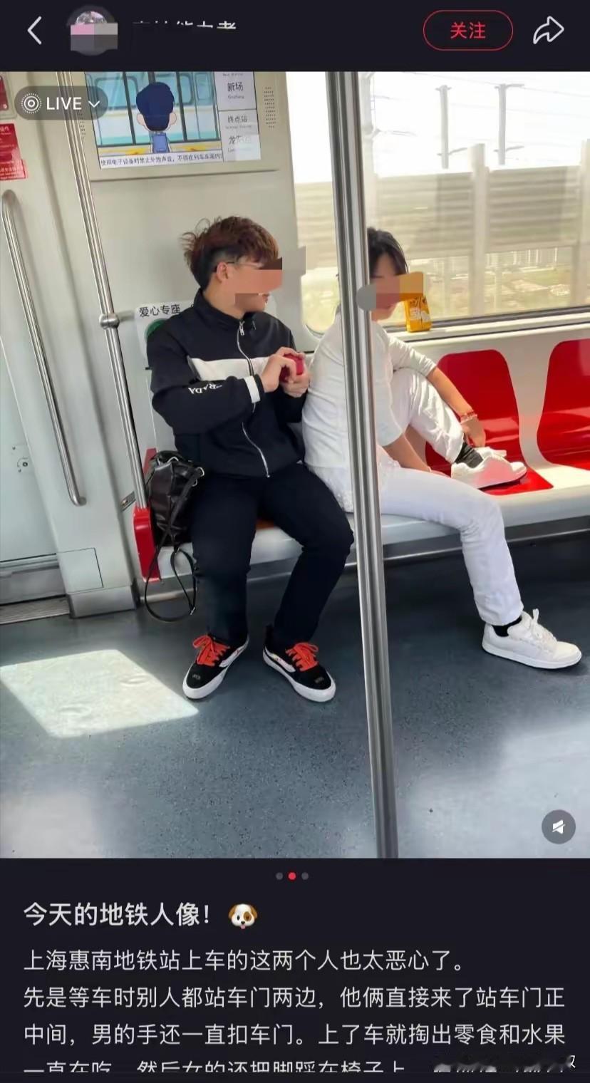今天继续聊聊上海地铁车厢里的各种乱像。前段时间有网友在上海地铁16号线车厢里看到两个外地宁坐没坐相,坐么就好好坐,为啥要把双脚放在座位上?而且网友看到他俩忙着吃零食和水果呢!有沪漂留言说也许这两人是惠南本地人。那么各位来评价一下。