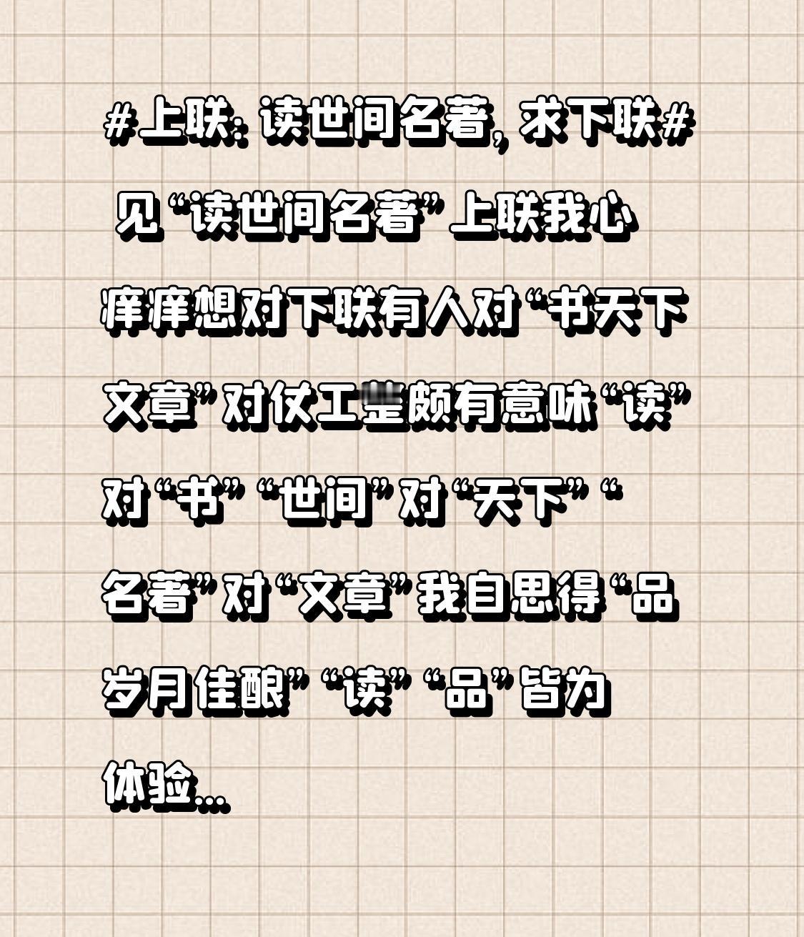 见“读世间名著”上联 我心痒痒想对下联 有人对“书天下文章” 对仗工整颇有意味 “读”对“书” “世间”对“天下” “名著”对“文章” 我自思得“品岁月佳酿” “读”“品”皆为体验动作 “世间”对应“岁月” 有时间空间之感 “名著”“佳酿”搭配巧妙 名著似佳酿越品越香 不知此下联大家看法如何