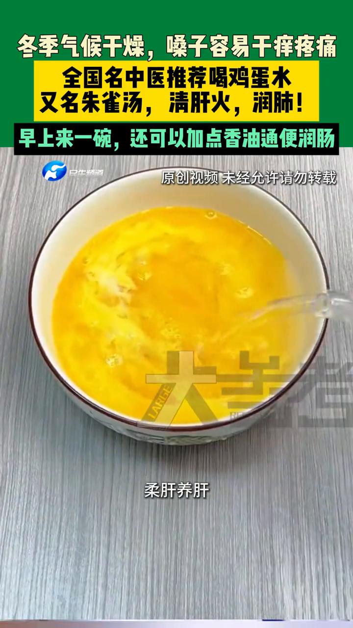 冬季气候干燥,嗓子容易干痒疼痛,全国名中医推荐喝鸡蛋水,又名朱雀汤,清肝火,润肺!早上来一碗,还可以加点香油通便润肠。 肝火旺,我们土方法,以柔肝养肝。打个鸡蛋,用开水一冲,多沏一点鸡蛋水,加点香油。鸡蛋我们叫鸡子黄,可以滋阴,又可以清热,香油还可以润肠通便。肝火旺盛汤 上火了喝什么汤 朱雀汤 红糖朱雀汤 气血朱雀汤 去肝火汤 生姜朱雀汤