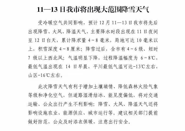 据省、市气象部门预报,山西省大部分地区将于本月11日至12日迎来大面积、大范围降雪。 请各位父老乡亲提前谋划,做好防护,增添衣物!