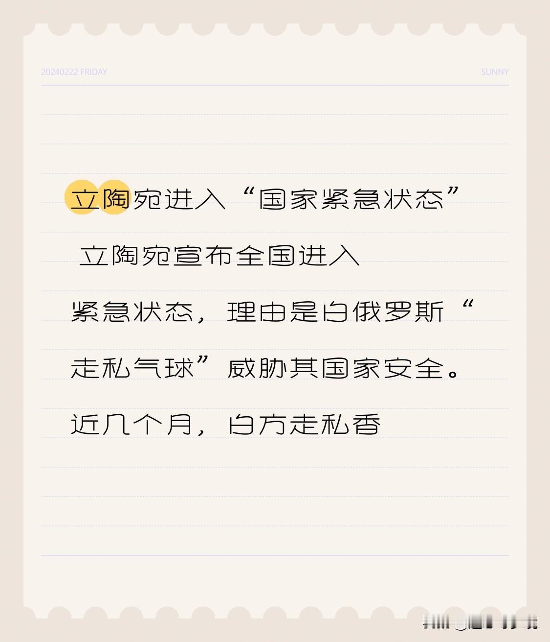 立陶宛进入“国家紧急状态” 立陶宛宣布全国进入紧急状态,理由是白俄罗斯“走私气球”威胁其国家安全。近几个月,白方走私香烟者投放的气象气球十余次干扰维尔纽斯机场运营,机场累计关闭超60小时,350余个航班和约5.1万名旅客受影响。 立政府不仅宣布紧急状态,还赋予军队额外自主权。总统瑙塞达还打算审查冻结或没收白方在立资产。可白俄罗斯多次否认,卢卡申科称立方指控荒谬,是在将事件“升级并政治化”。立陶宛作为北约成员国和乌坚定支持者,这波操作不知是真的“如临大敌”,还是另有政治目的,实在让人捉摸不透。